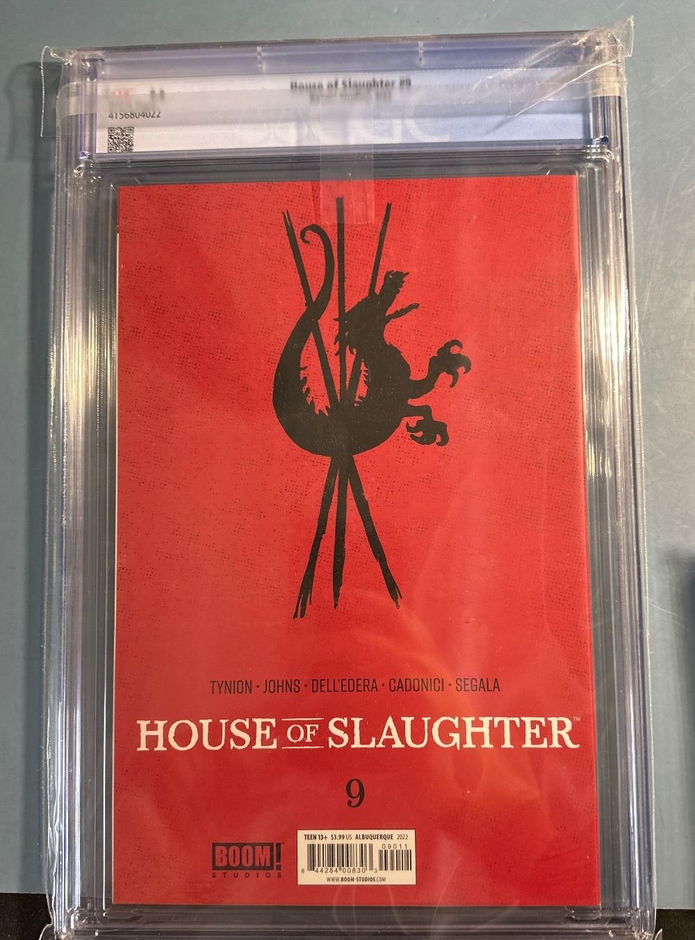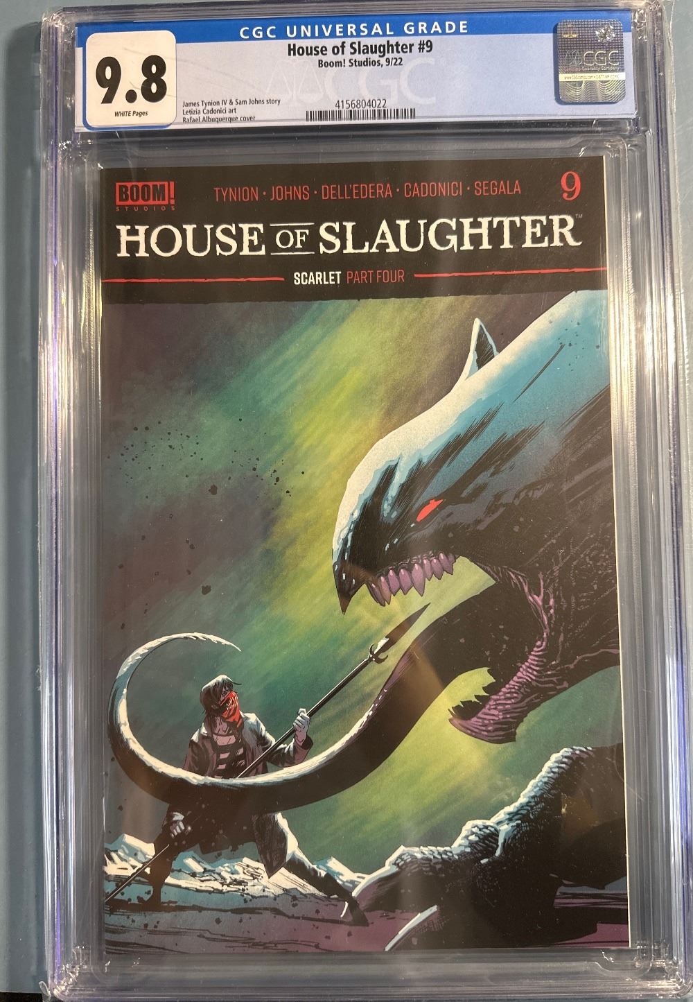 Graded comic: House of Slaughter #9 from Boom! Studios, published in 2022. Graded 9.8 NM/Mint by CGC with white pages. Story by Tynion & Johns, art by Cadonici, cover by Dell'Edera. SKU: IC-20260213-150-72-J -260213-2