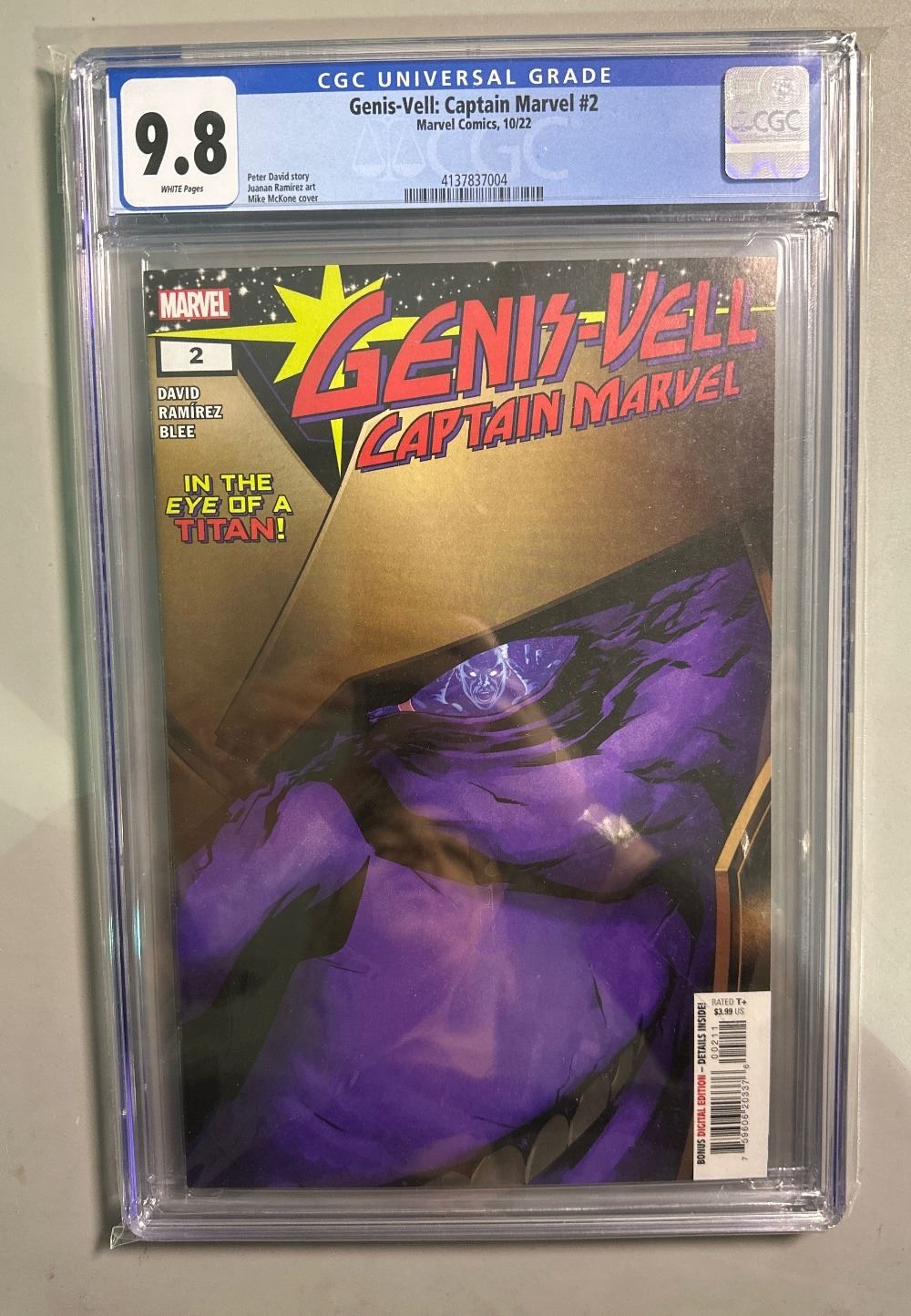 Genis-Vell: Captain Marvel #2, published by Marvel in 2022. Graded CGC 9.8 with white pages. Story by Peter David, art by Juanan Ramirez, and cover by Mike McKone. Encased in a protective CGC slab. SKU: IC-20260223-130-73-J-260223-4