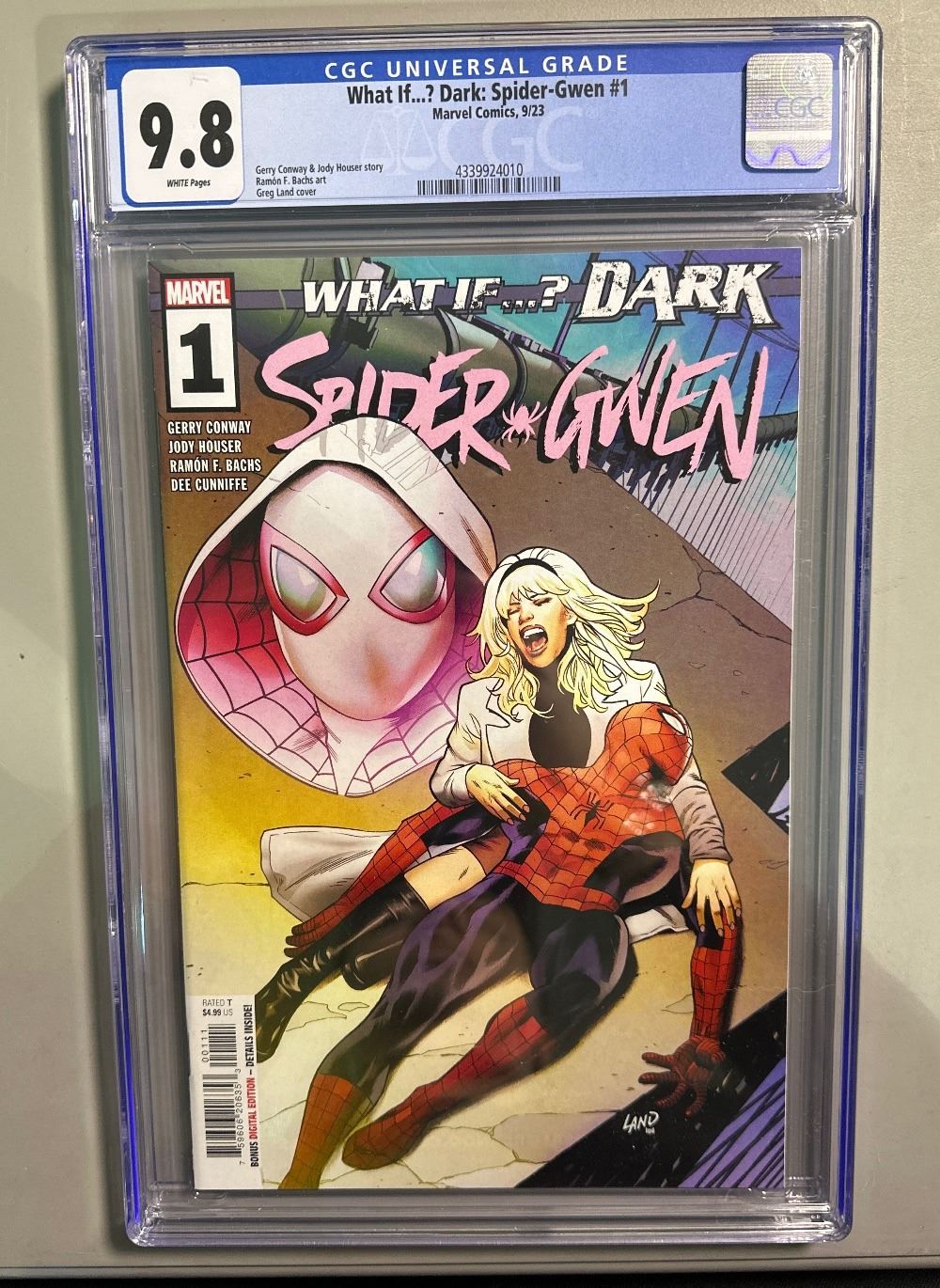 What If...? Dark: Spider-Gwen #1 graded by CGC at a 9.8 Near Mint/Mint. This 2023 Marvel comic features a story by Gerry Conway and Jody Houser, with art by Ramon Bachs and the main cover by Greg Land. SKU: IC-20260223-130-73-J-260223-7