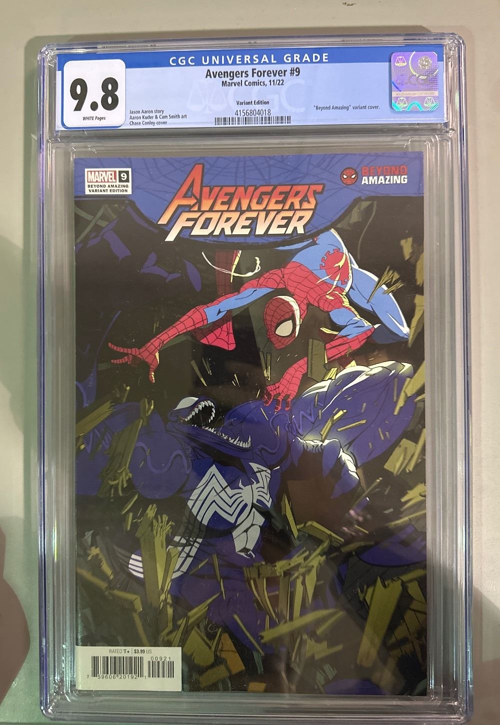 Avengers Forever #9 'Beyond Amazing' Spider-Man vs Venom variant cover by Chaca Conley. Professionally graded by CGC at 9.8 with white pages. Published by Marvel Comics in November 2022. SKU: IC-20260224-245-74-J-260226-100