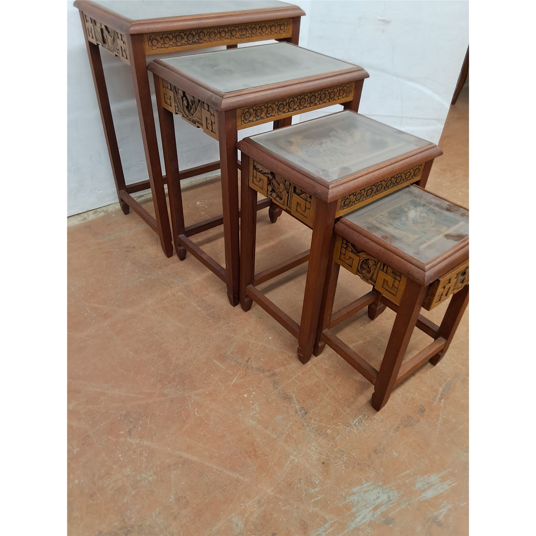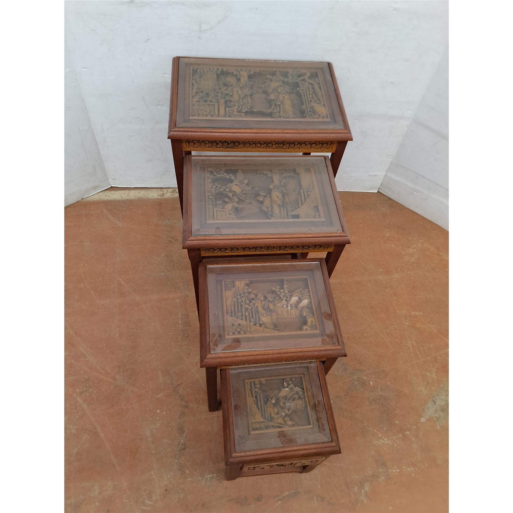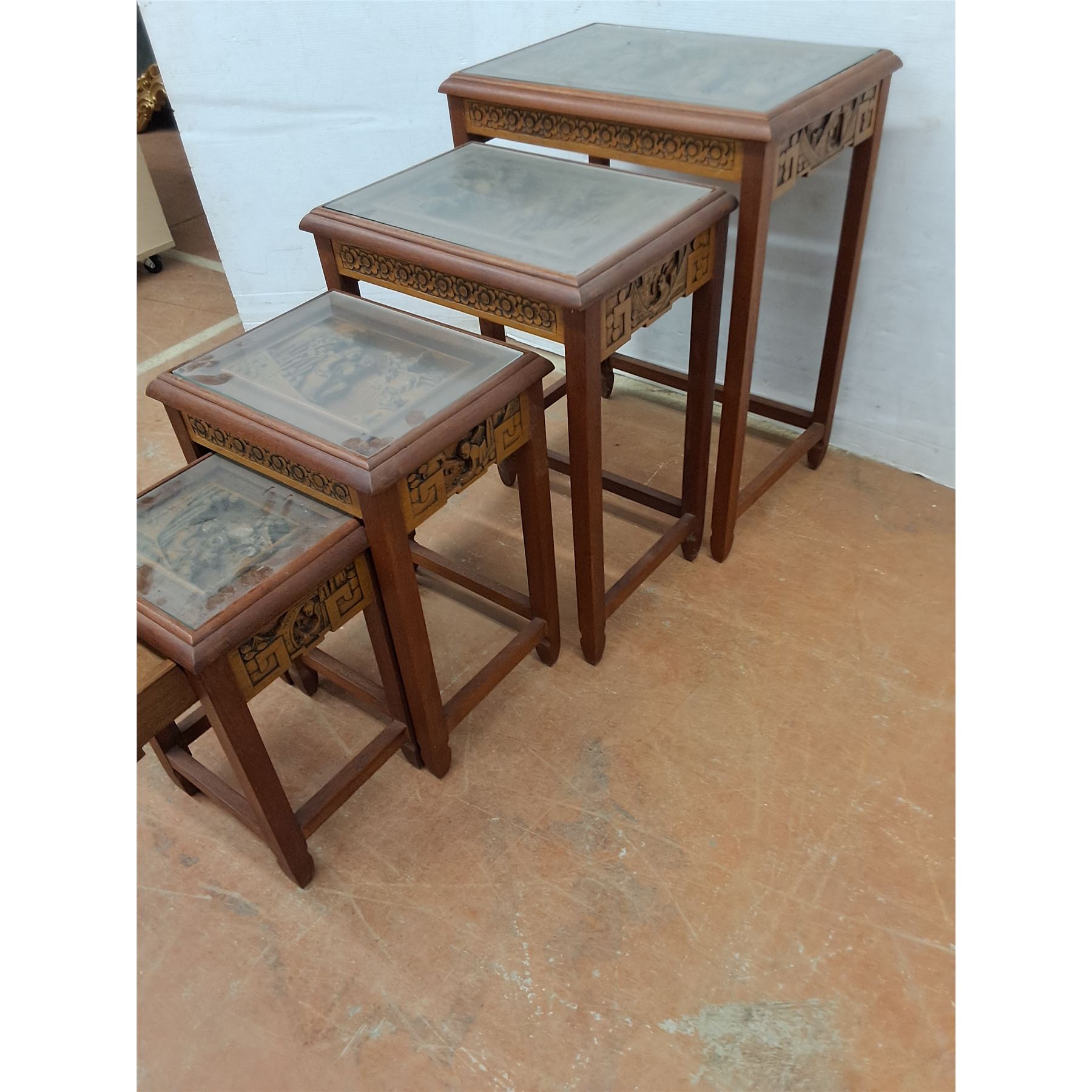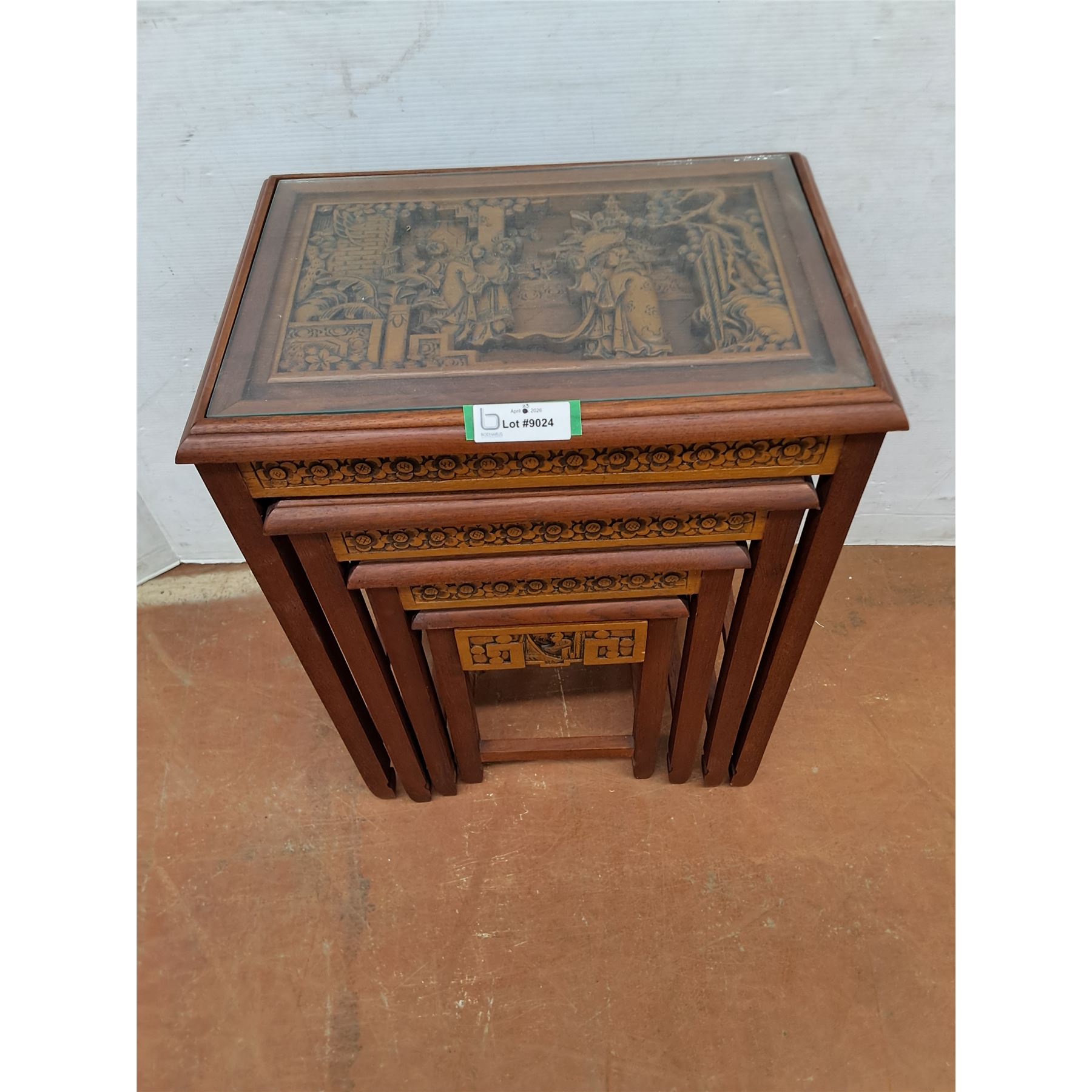Lot 9024 * Set of 4 Chinese Carved-Wood Nesting Tables w/Removable Glass - Largest 26x20x14" - PU Only