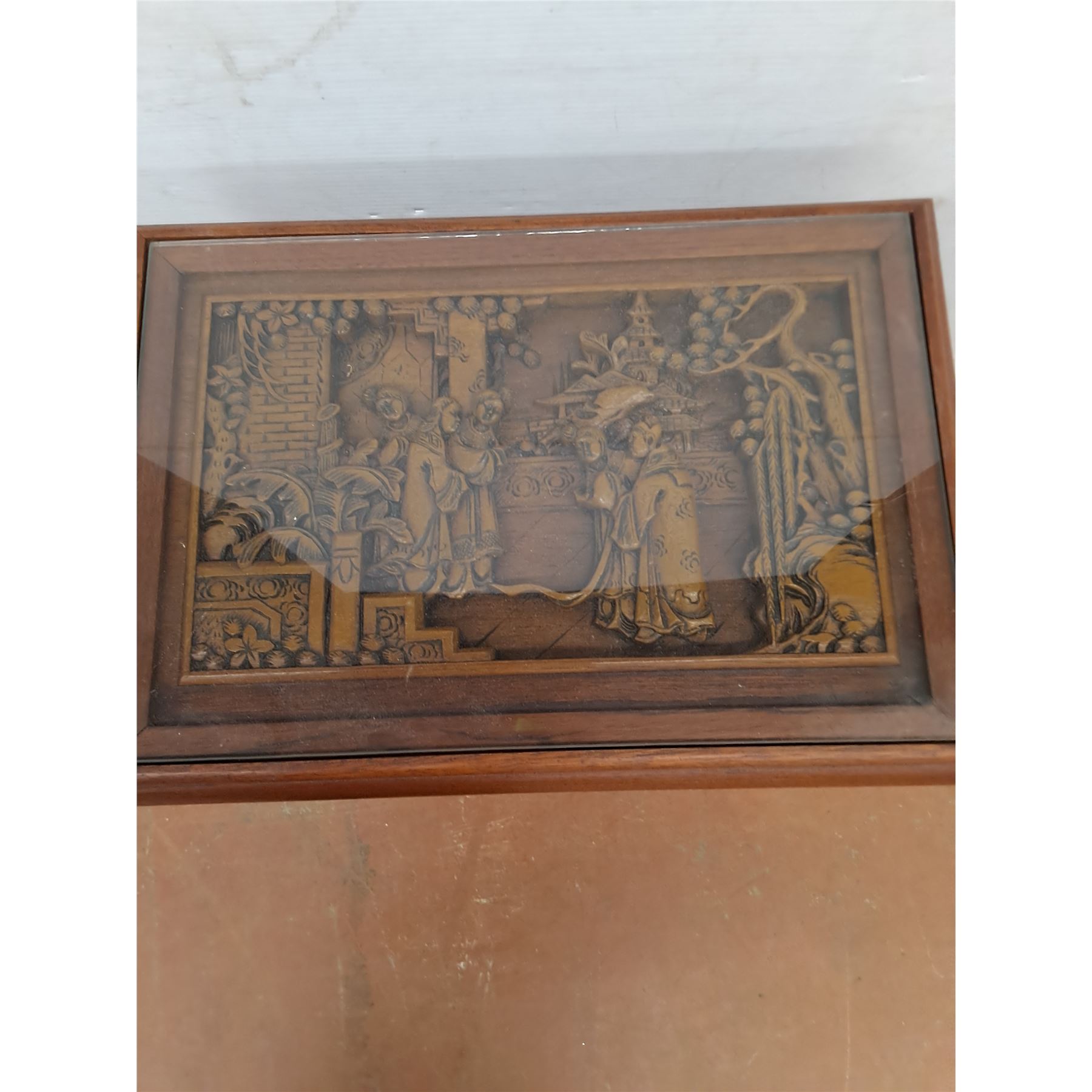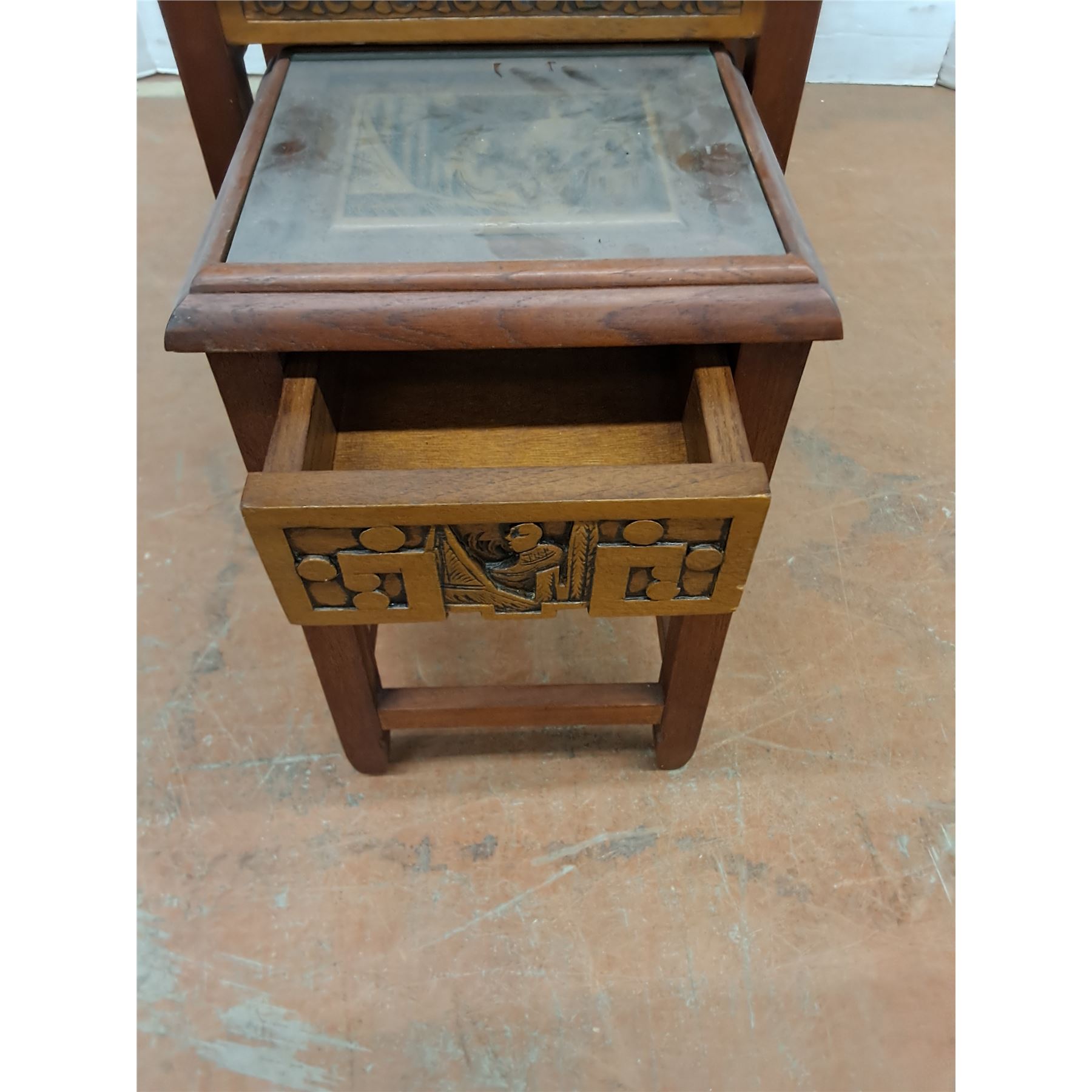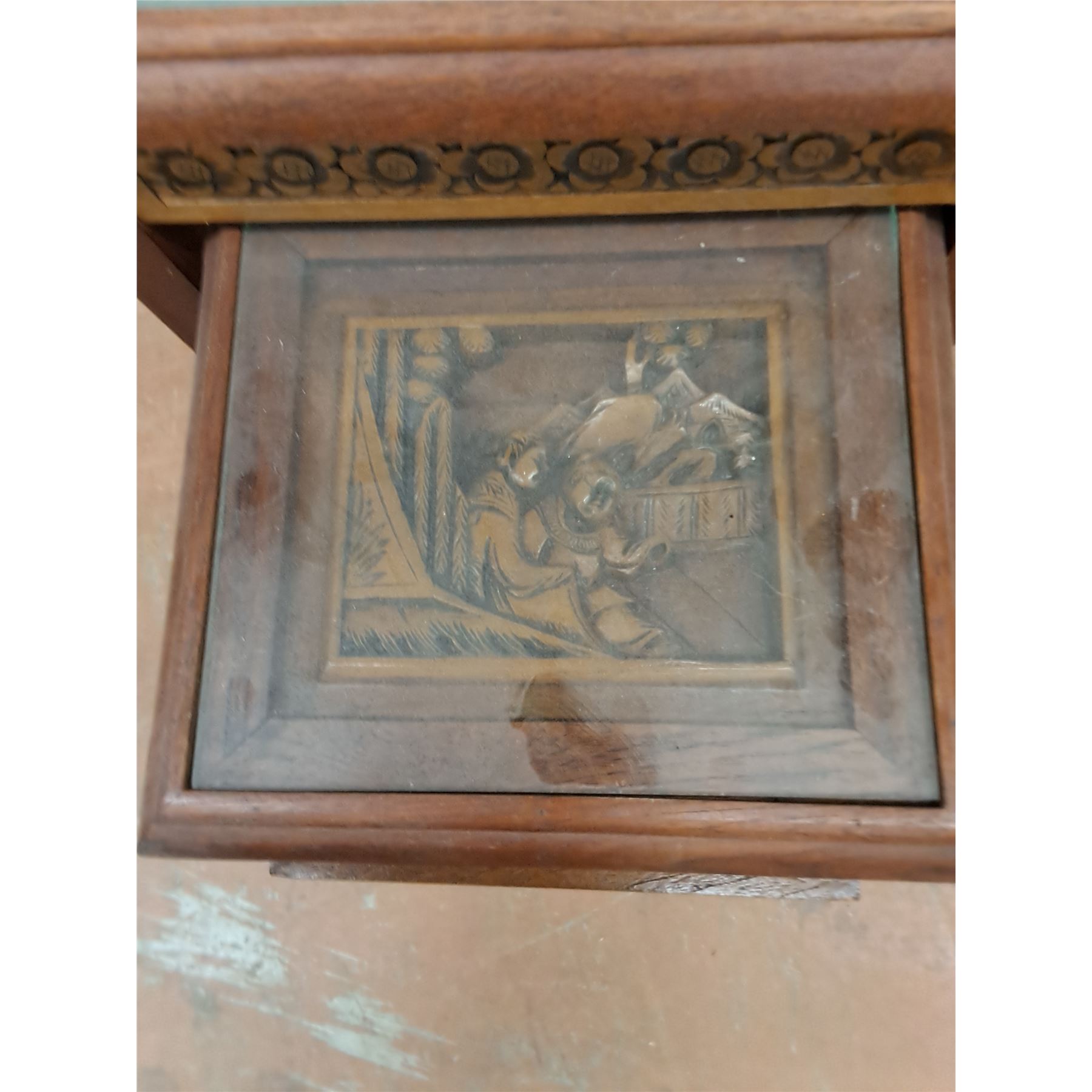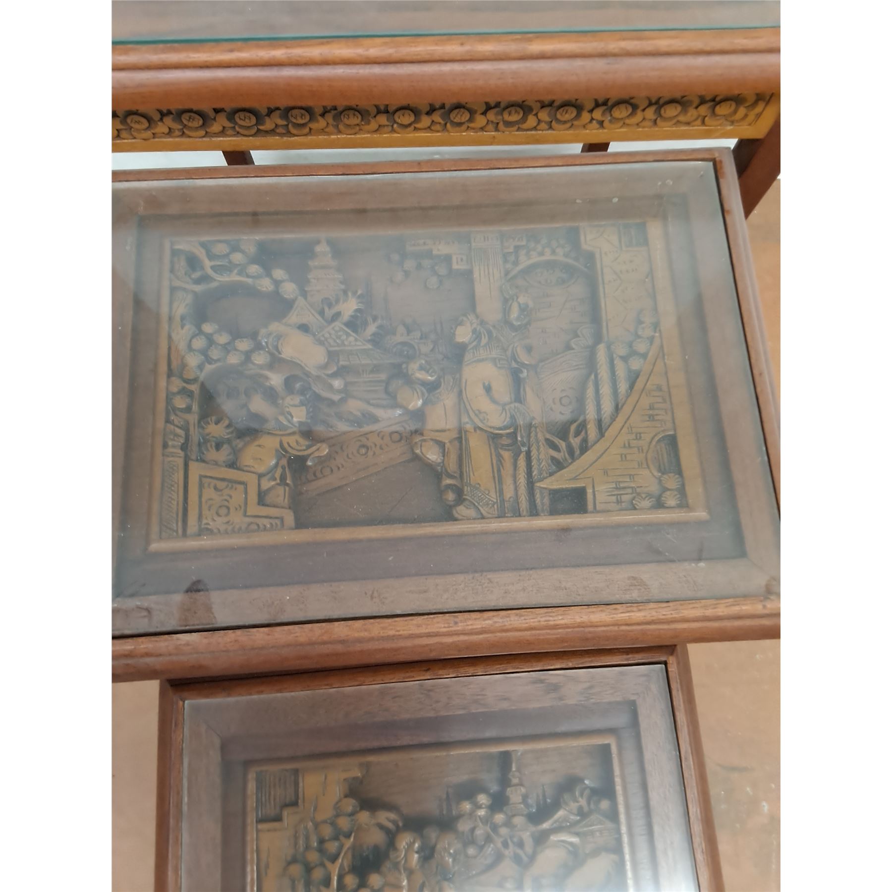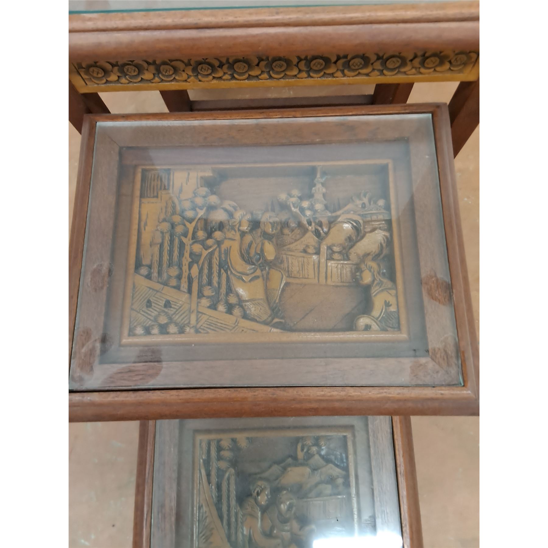 Lot 9024 * Set of 4 Chinese Carved-Wood Nesting Tables w/Removable Glass - Largest 26x20x14" - PU Only