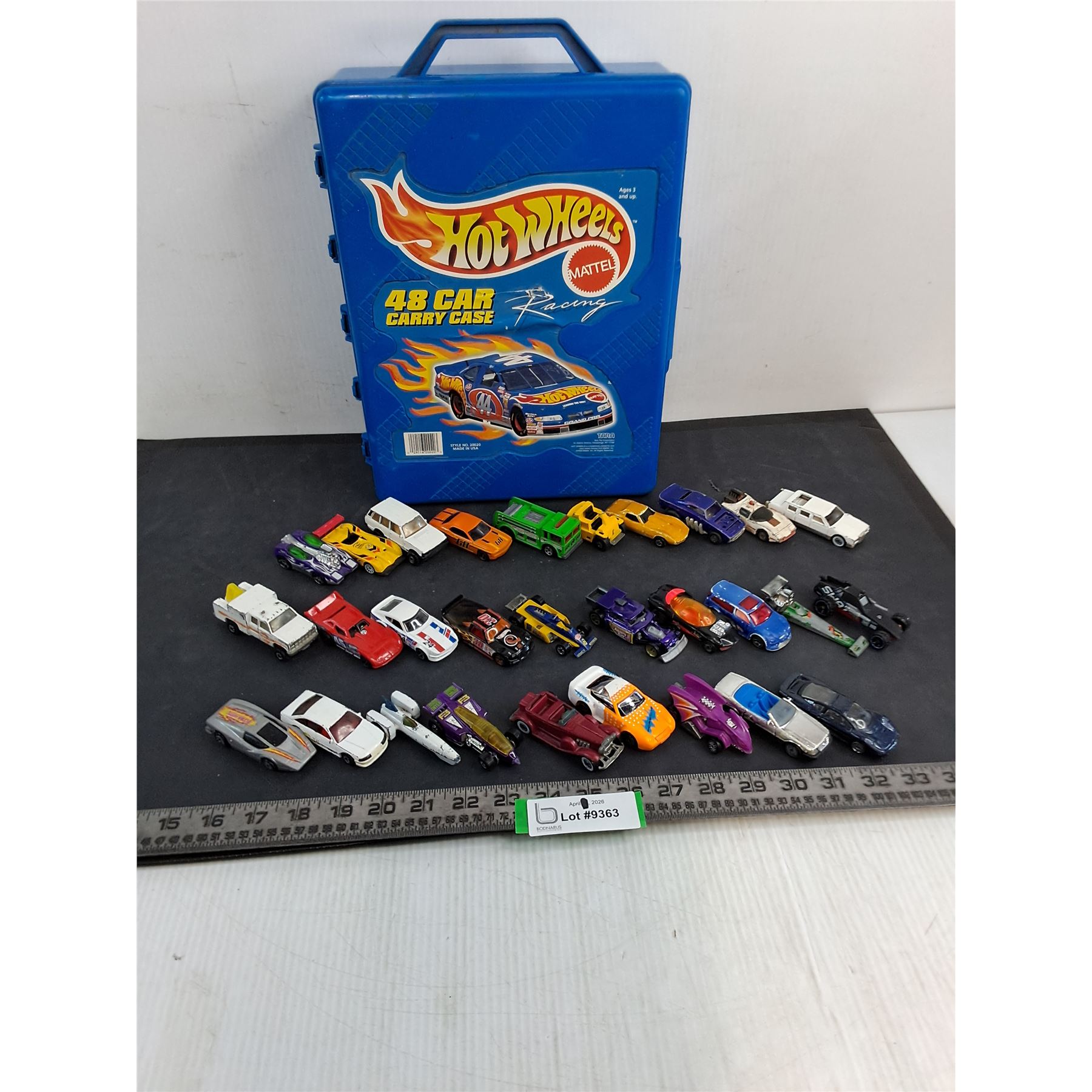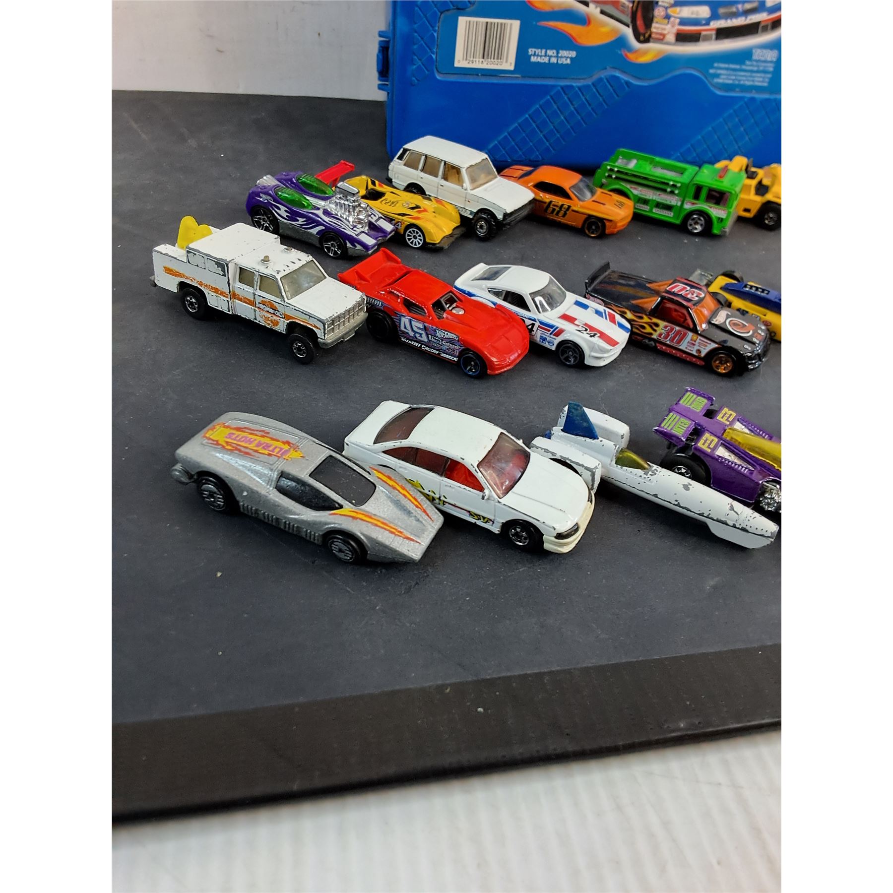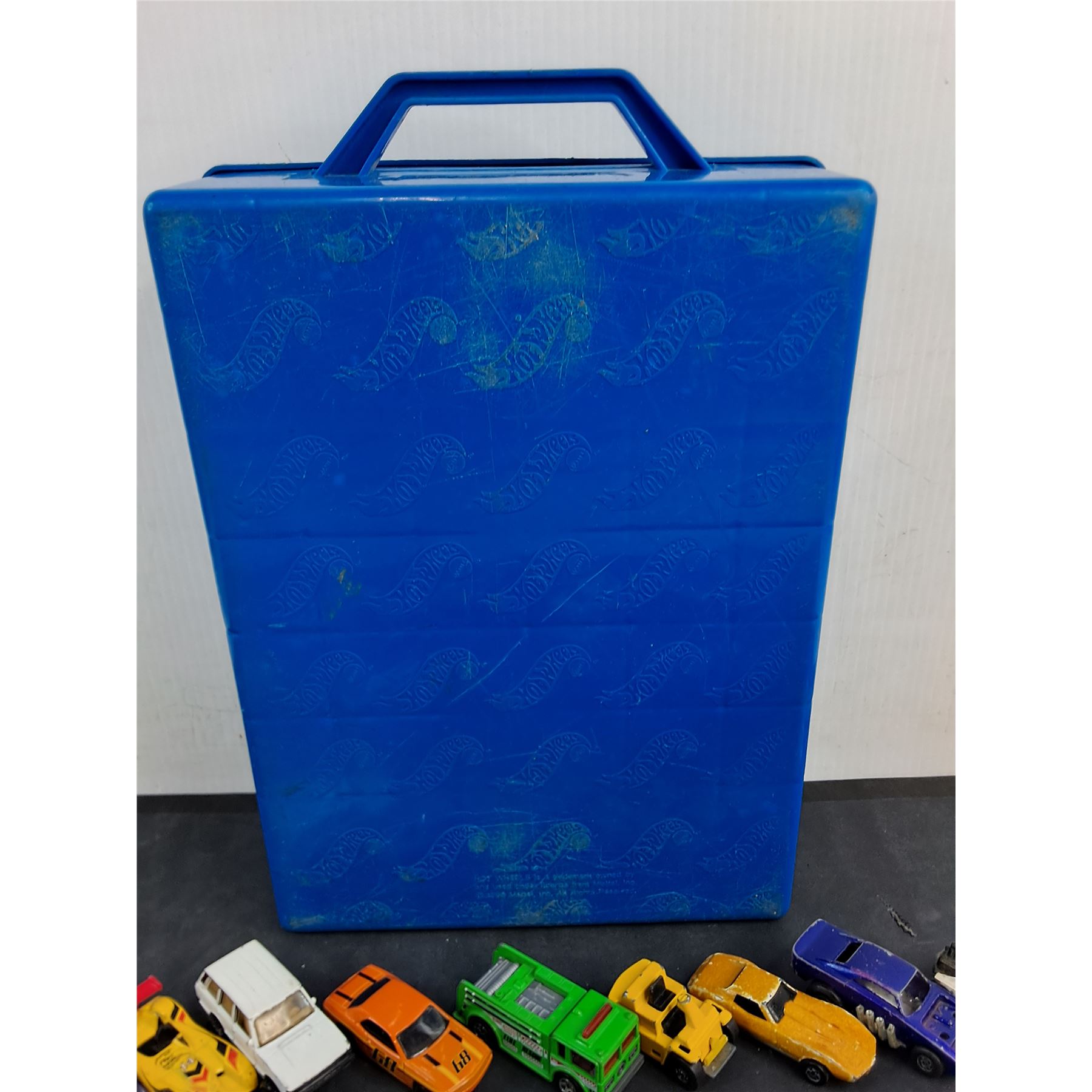 Lot 9363 (29) Assorted Dinky Cars w/Hot Wheels Storage Tote - Some Cars Damaged