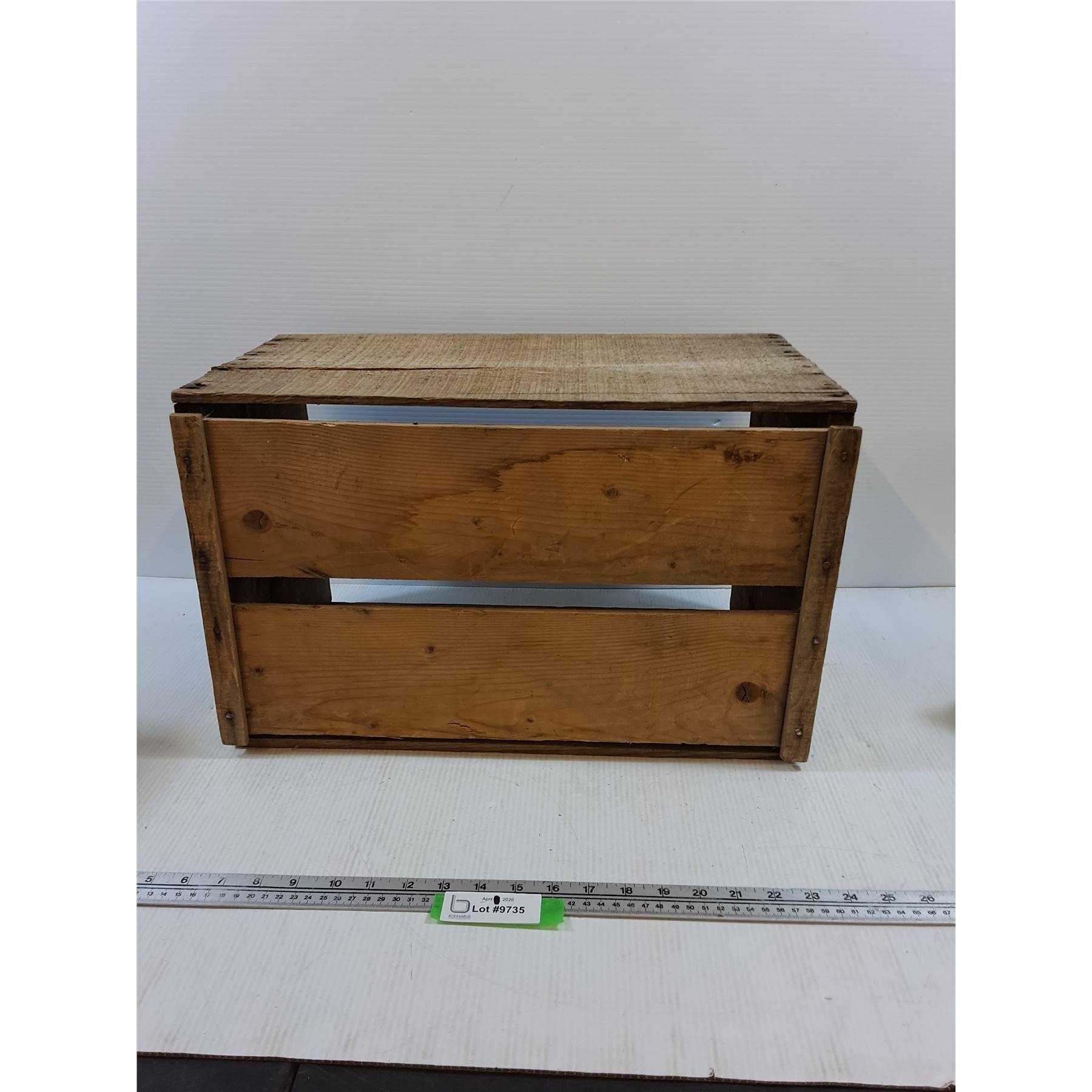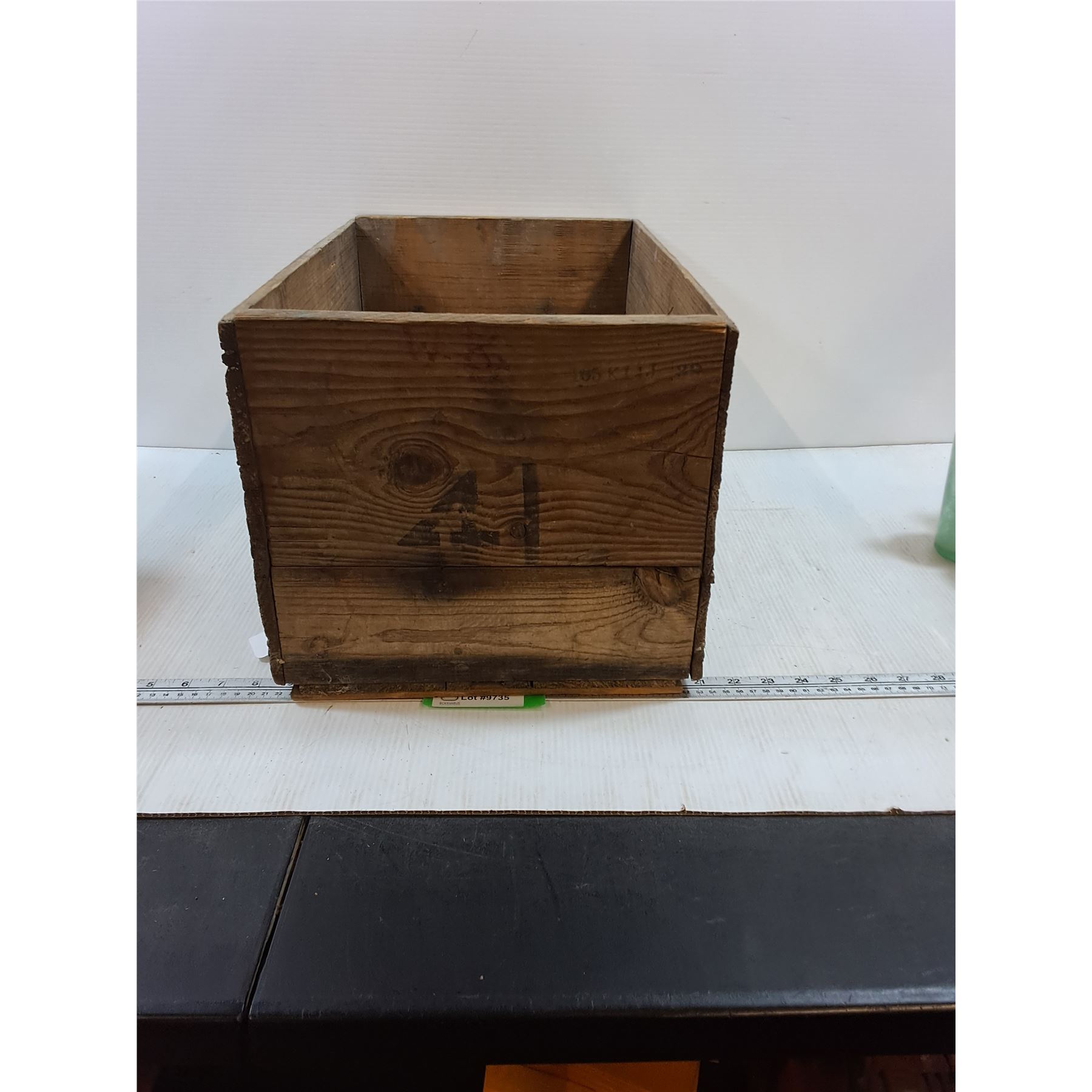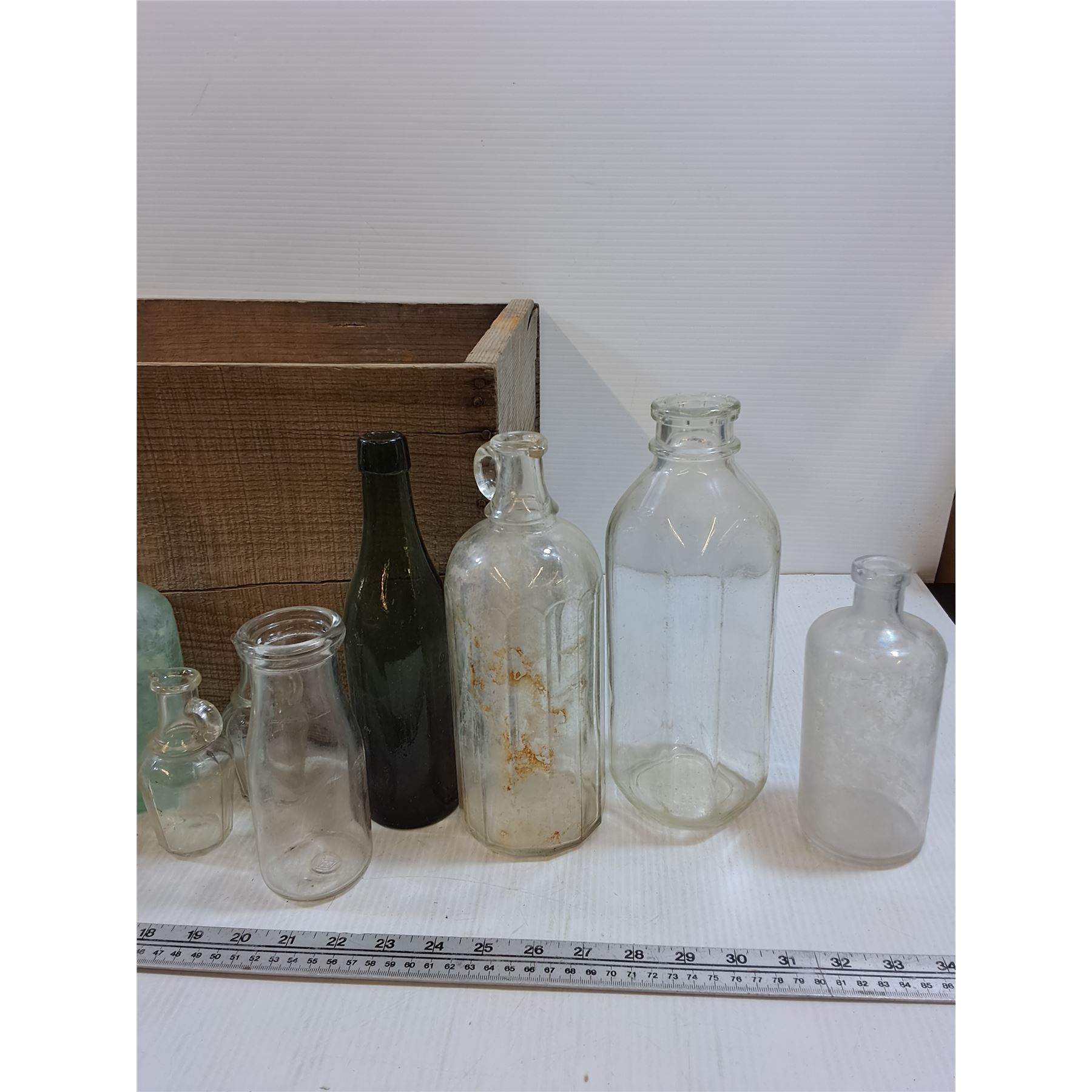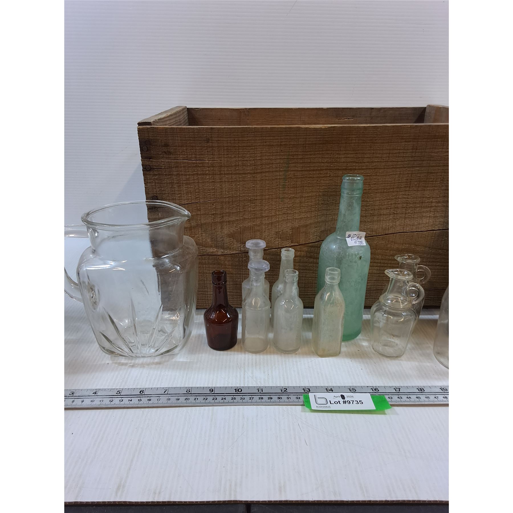 Lot 9735 Wood Crate with Various Glass Bottles and Pitcher-19x12x11" crate dimensions- PICK UP