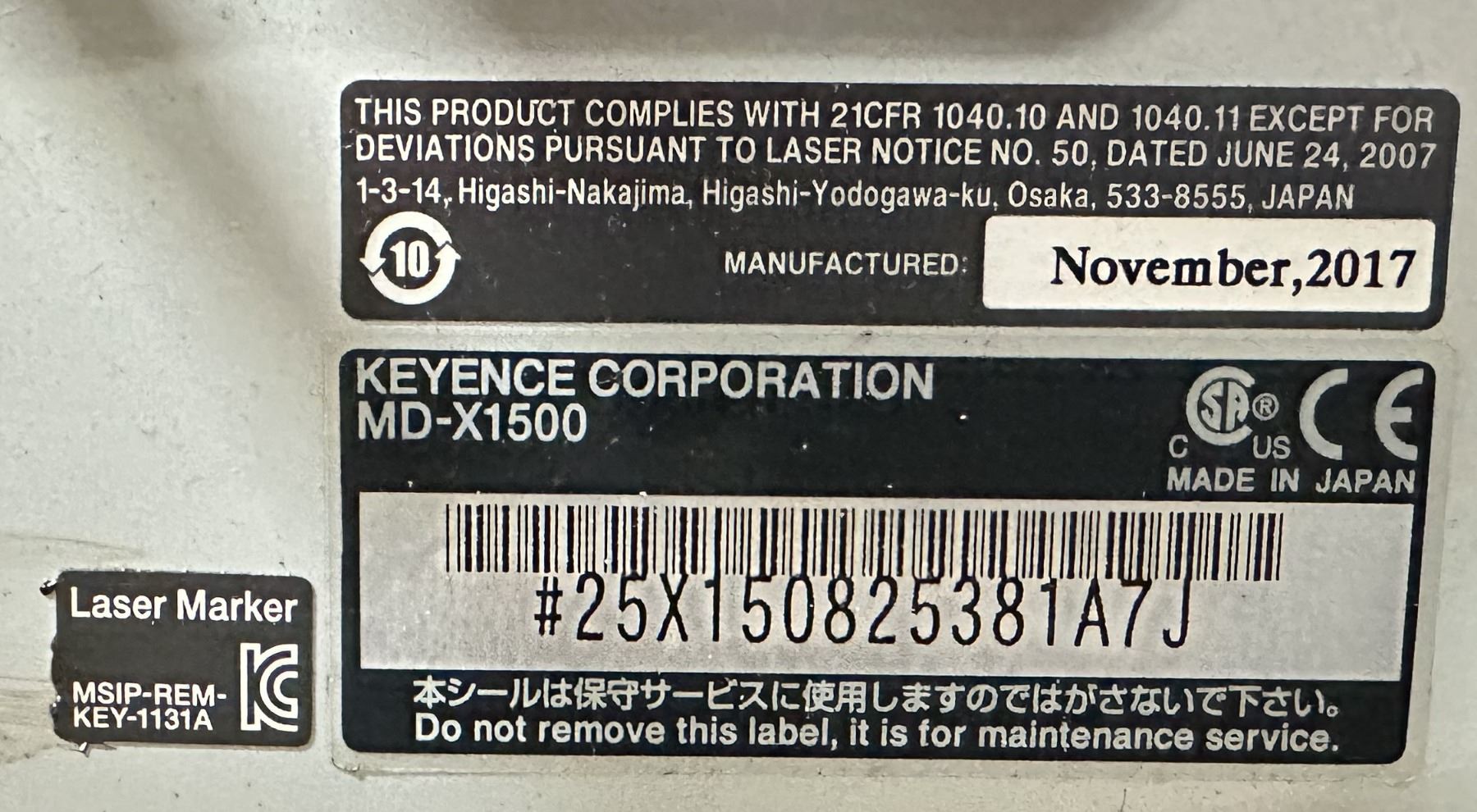 Lot 118P Keyence #MD-X1500 3-Axis Hybrid Laser Marker w/Power Supply / Controller