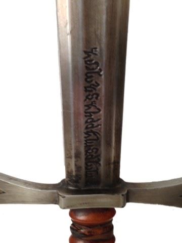 Straight from the set of Lionsgate's supernatural thriller The Last Witch Hunter comes Kaulder's (Vin Diesel) hero screen used, stunt sword! This was featured heavily in the movie and the sword is production constucted with a resin blade and wood handle sword. There is symbolic writng inscribed and a special symbol on the handle. This sword is slightly shorter than the hero sword and was used on screen in many sequences in the film.(34x8)