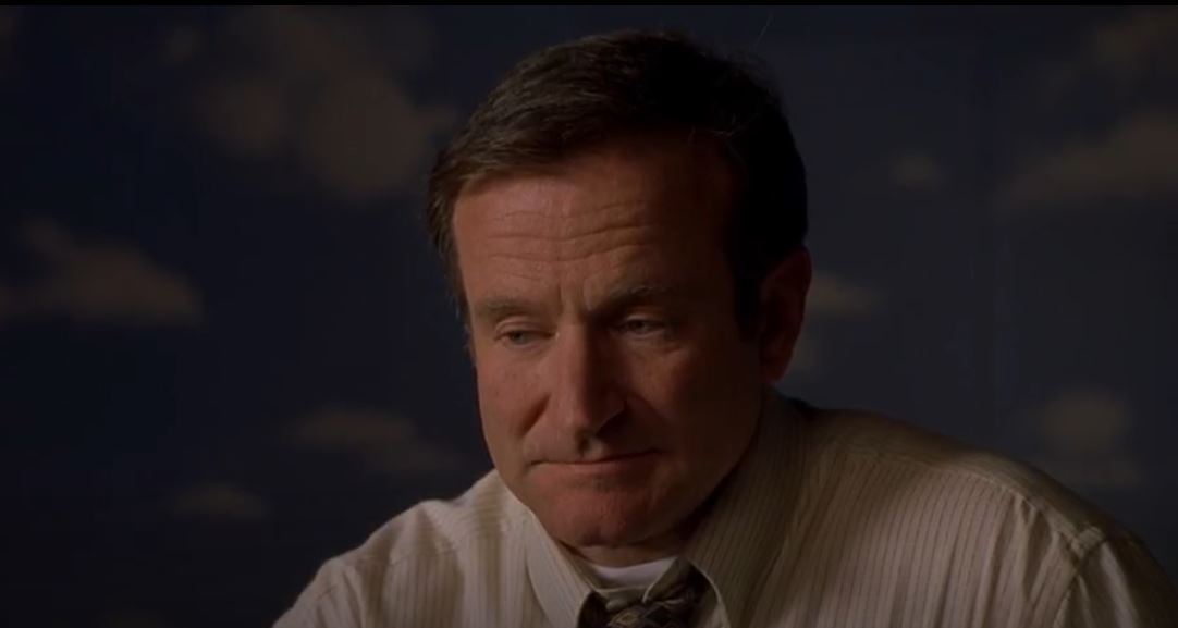 What Dreams May Come (1998) - Chris (Robin Williams) screen worn Yves Saint Laurent (16 and 1/2, 34–35 – L) pale yellow with fine white and navy stripes dress shirt, and a navy with brown design navy with amber diamond Kenneth Cole tie.