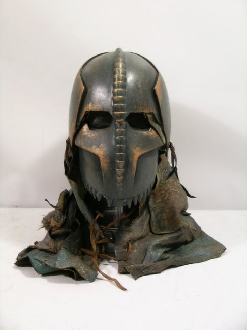 Heraklion Soldier screen worn helmet and mask. Original, production made and screen-worn helmet and mask set used by a Heraklion soldier in the visionary action-fantasy Immortals. As part of King Hyperion’s (Mickey Rourke) brutal scorched-earth campaign across Greece, the Heraklion soldiers were designed to look like faceless, insectoid nightmares—a stark contrast to the golden aesthetics of the Gods. Mask & Helmet are mconstructed from high-impact hard plastic and resin, the helmet features the signature "Heraklion" silhouette. It is finished in a weathered copper and deep brown palette, meticulously hand-painted by the production team to simulate battle-worn ancient metal. The centerpiece of the design is the flip-up front mask. This articulated faceplate allowed performers to transition between a closed-face "monster" look for wide shots and an open-face configuration for visibility and comfort between takes. The helmet features a custom-integrated leather mantle that hangs over the shoulders and neck. This leather was treated to look aged and "grimy," consistent with the nomadic, war-torn lifestyle of Hyperion's legions. Costume designer Eiko Ishioka intended for the Heraklion army to look "animalistic and terrifying." This helmet is a prime example of that vision, moving away from historical Greek accuracy toward a dark, surrealist fantasy. This is the last one like this available from the film. Premiere Props sold the original movie props and costumes from this film and this helmet was just released from the archives.
