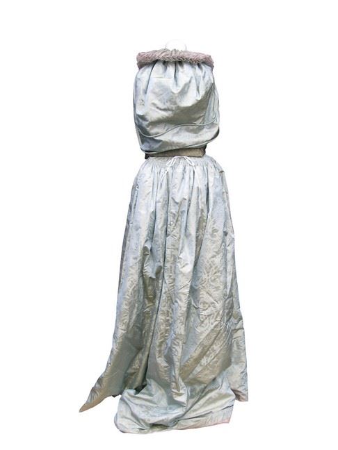 Milady (Milla Jovovich) screen worn, hero, custom made grey self floral print with clips on the front and lace design behind the head top, and grey with self floral print, clips and ties in the back long dress.