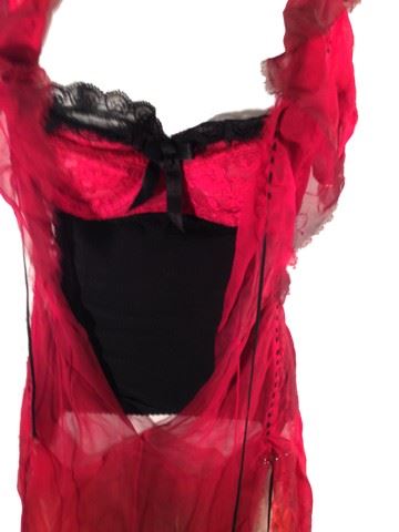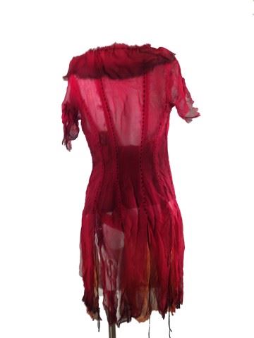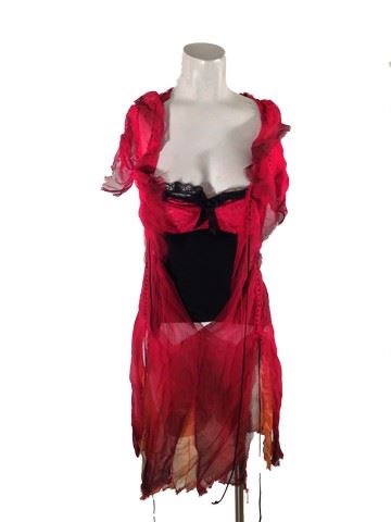 Female Dancer, screen worn, hero, red see through chiffon dress open in the front with black stitching and ties, bottom half of the dress is shredded for a peek-a-boo affect, black and red bodice with attached garters no panties with the bodice, the bodice is sewn onto the chiffon dress, black lace up ankle boots with a heel.