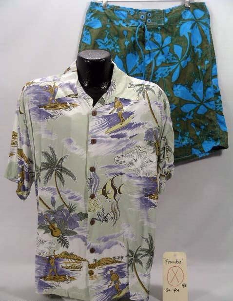 Frankie (Justin Timberlake) SS Sage Hawaiian Print Button Front (size L/ design depicts surfers & palm trees) Turquois & Olive "Mossimo" Board Shorts (size 34/ velcro fly & drawstring waist/ abstract print) (screen worn/ includes costume dept. wardrobe tag)