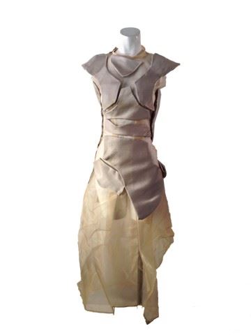 Project Runway All Stars - garment # 642- Season 6, Episode 3 -Designer: Merline. This is a sheer nude cap sleeve dress with mesh bottom and nude geometric pieces connected by mesh to comprise the top half of the dress.