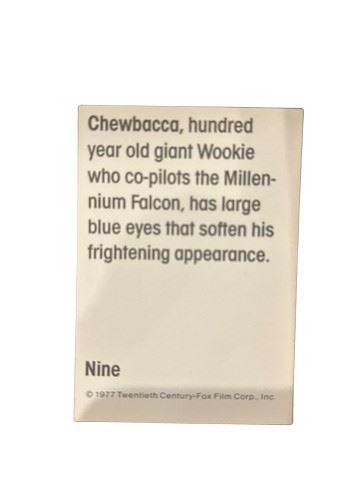 1977 Twentieth Century Fox Film Corp Star Wars Chewbacca Wonder Bread promotion rookie trading card. Excellent condition. Rare. #9 in the series.
