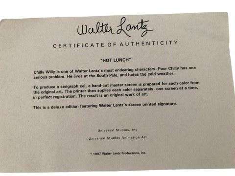 Walter Lantz “Hot Lunch“ serigraph cel, with certified of authenticity. Chilly Willy is one of Walter lances most endearing characters pork chili has one serious problem. He lives at the south pole, and hates the cold weather. To produce a serigraph cell, a hand cut master screen is prepared for each color from the original art. The printer that applies each color separately, one screen at a time, and perfect registration. The result is an original work of art. This is a Deluxe Edition featuring Walter Lantz’s screen printed signature. 1997. The frame also includes a check made out to Robert Lee Miller for $350 with a net amount of $225.32 from Walter Lantz productions. This is a payroll check issued on February 8, 1978. Robert Lee Miller was Walter Lantz’s right hand man.