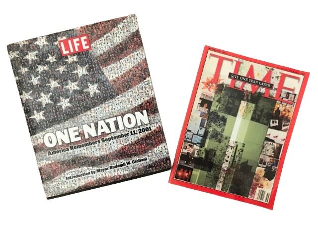 A Time Magazine (9/11 One Year Later) and hardcover book By Life called “One Nation” commemorating 9-11.