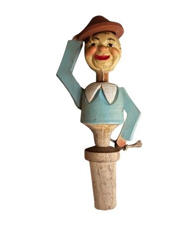 Vintage, hand carved Anri mechanical wine bottle stopper. Made of hand carved and painted wood. This depicts a man who tips his hat when a string on the back is pulled down. Made in Italy by the renowned Anri wood carvers dated to the 1940's-1960s. Designed to fit a standard wine bottle.