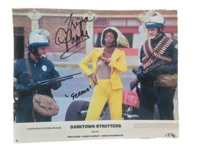 Three signed photos from Trina Parks personal collection featuring publicity stills from her starring roles in the films "Darktown Strutters" and "Immortal Kiss" Trina Parks was the first African American singer and dancer featured in the Palm Springs Follies for 6 years from 2002-2008. (photos range slightly in size, most are approx. 8 1/2" x 11)