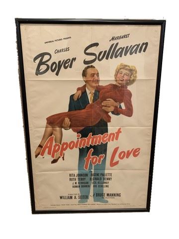 "Appointment for Love" (1941) starring Charles Boyer and Margaret Sullavan, original, framed Litho movie poster. Poster has been protected by the frame for many years as this hung on the walls of the Debbie Reynolds Dance Studio. Litho #21344. Note: We can look into removing the frame from this item to save money on shipping charges.