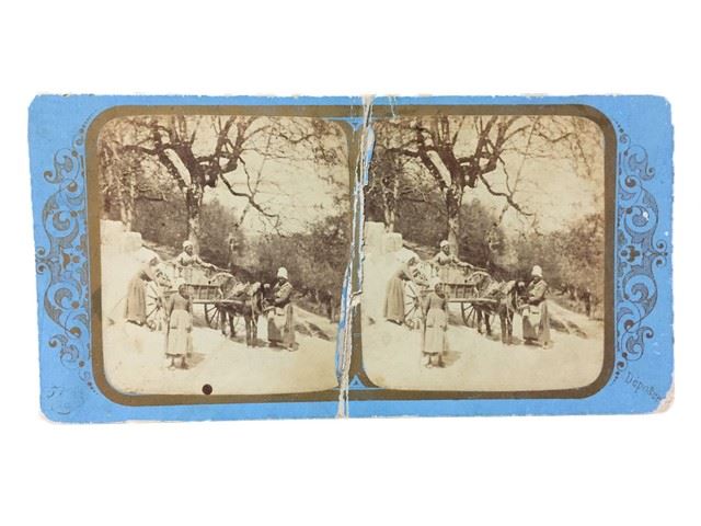 These are extremely rare hand-tinted vintage stereograph images (4) on tan rectangular mounts depicting life in the late 19th century ca. 1893-1900. (approx. 7 x 3 ½ in.) published by George W. Griffith. The stereograph is a pair of images of the same subject taken from slightly different angles that gives the illusion of a single three-dimensional image when viewed through a stereoscope (not included). The images in this collection are: Keystone Vierra Company, Manufactures and Publisher 534(b) She: “It Will Soon Strike One.” Meadville, PA - St. Louis Mo. Copyright, 1893, by B.L. Lingley – verso two are blank others have captions and conversations in German, French and Spanish and sold only by Griffith & Griffith Philadelphia, Chicago, London, Hamburg, Ger. Milan. Italy 2354 Mother is in Dreamland. Copyright 1900 by Geo W. Griffith and Keystone View Company Manufacturers and Publishers 9500-The Male Robber at Work Meadville, PA - St. Louis Mo. Copyright, 1893, by B.L. Lingley. There is one stereograph image depicting four African American women beside a mule cart. This stereograph is mounted on a powered blue cardboard with gold border ornamental design. All of these stereographs are in fair to good condition with pencil markings, folds and normal wear and tear.