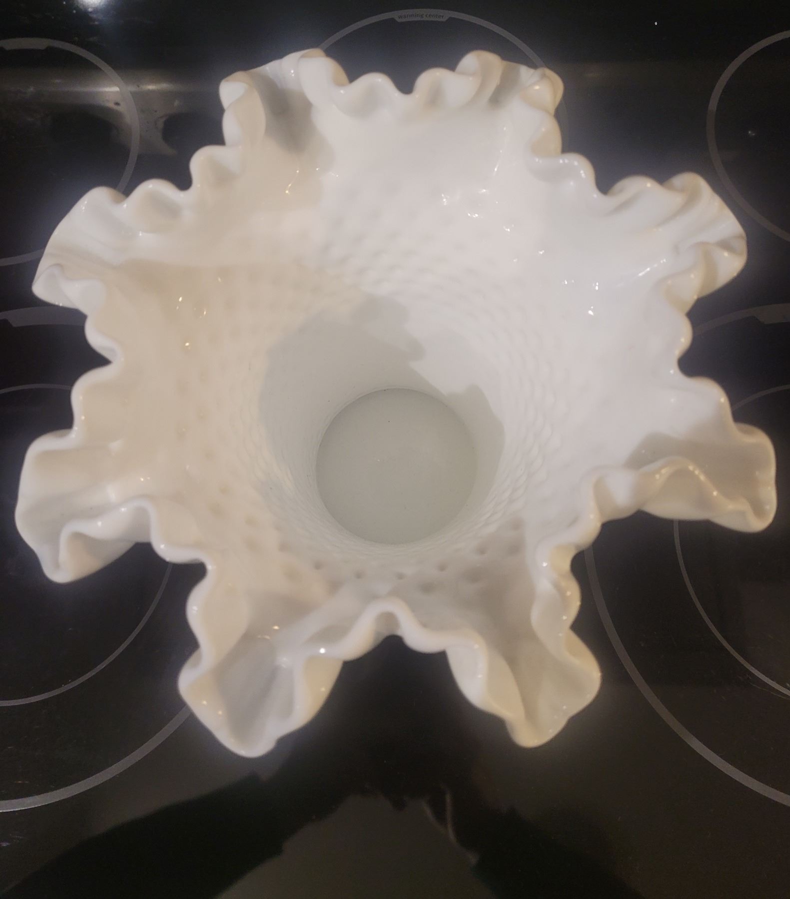 Lot 1056 Antique ruffled edge polka dotmilk glass vase - 8"tall x 8" wide at upper edge - in pristine conditi