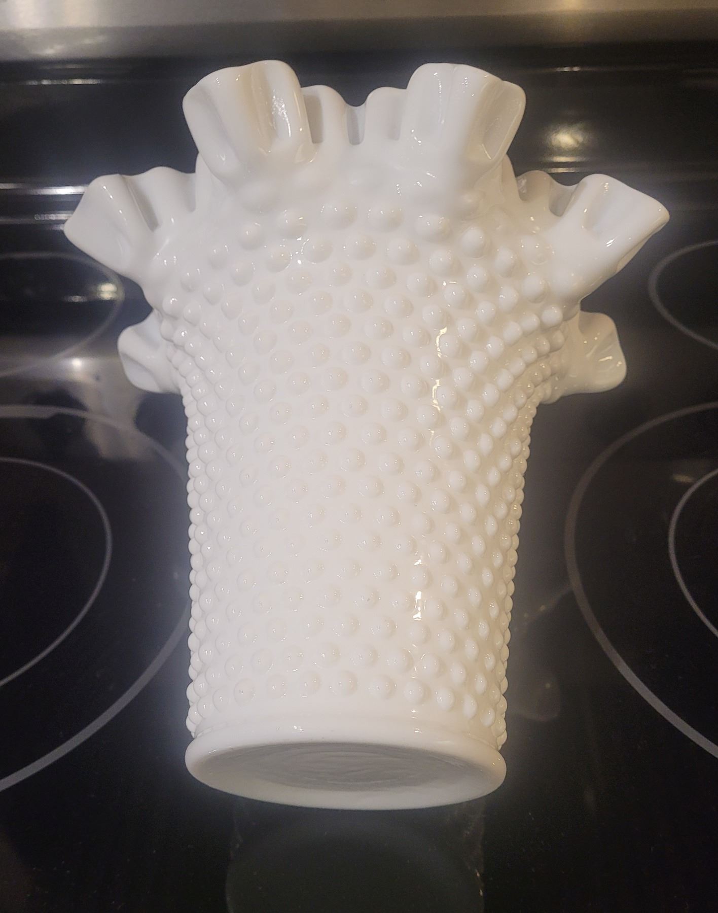 Antique ruffled edge polka dotmilk glass vase - 8"tall x 8" wide at upper edge - in pristine condition