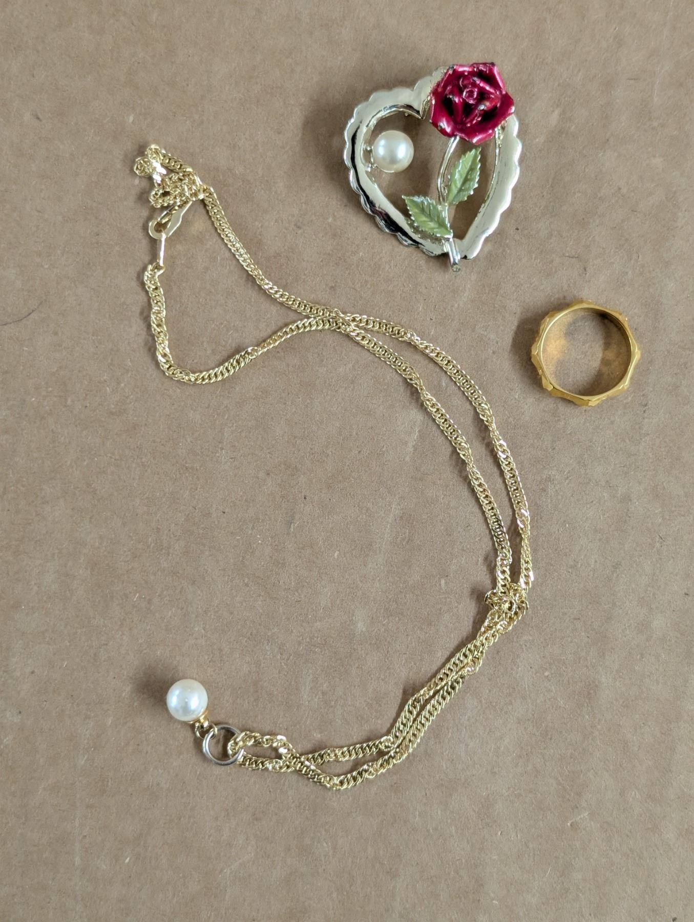 Lot 1220 14KT G.P, Necklace (Unverified) W/ Ring and Rose/Pearl Heart Pendant