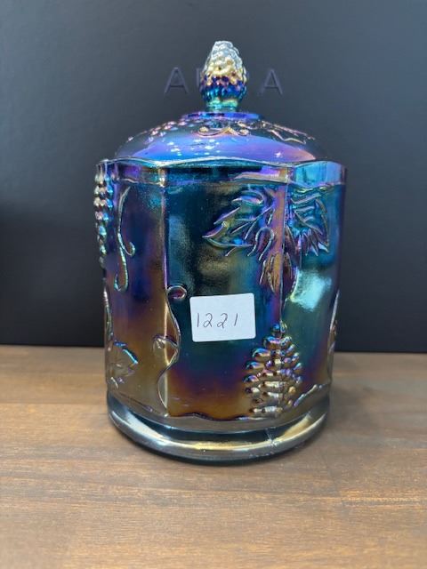 Lot 1221 Blue Carnival Glass “Harvest Grape” Canister with Lid