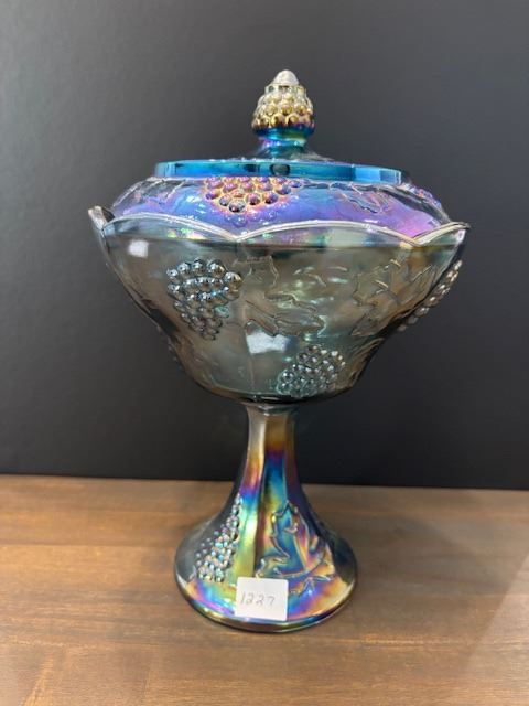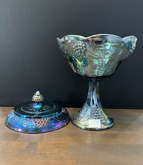 Lot 1227 Blue Carnival Glass “Harvest Grape” Pedestal Compote Bowl with Lid