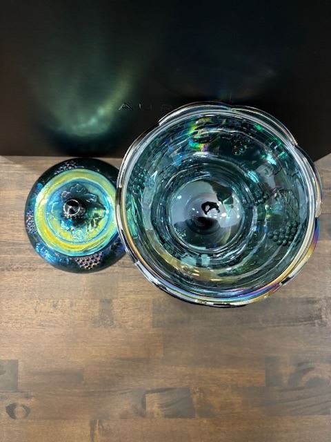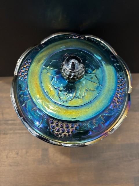 Blue Carnival Glass “Harvest Grape” Pedestal Compote Bowl with Lid