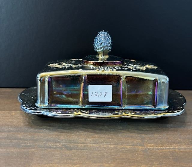 Lot 1228 Blue Carnival Glass “Harvest Grape” Covered Butter Dish