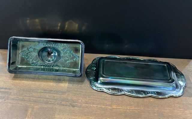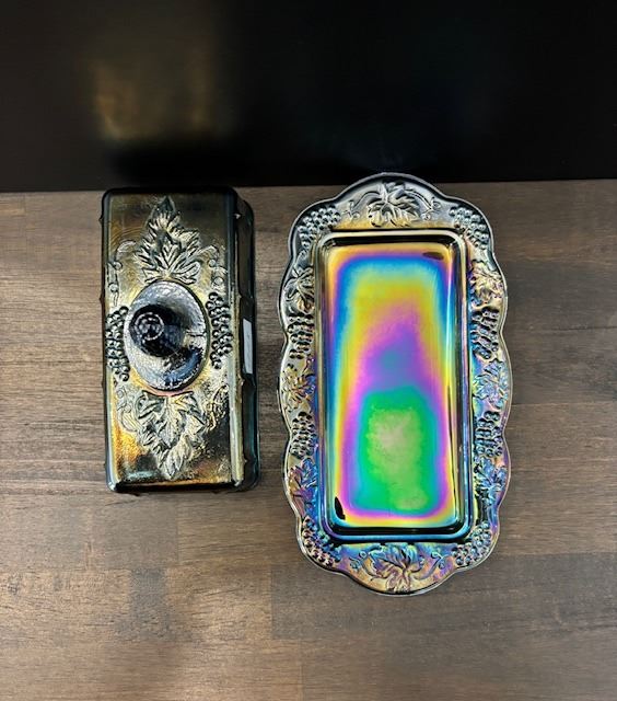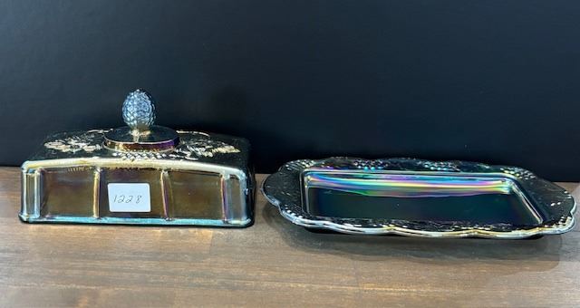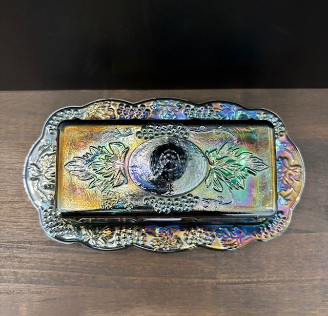 Blue Carnival Glass “Harvest Grape” Covered Butter Dish