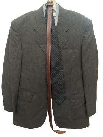The Way of the Gun (2000) – Obeck (Nicky Katt) screen worn Manzetti, charcoal, gray, three button suit blazer with matching dress pants, a gray Perry Ellis long sleeve dress shirt (size 15 1/2) with a DKNY tie, and a brown leather belt. Includes costume department wardrobe tag.