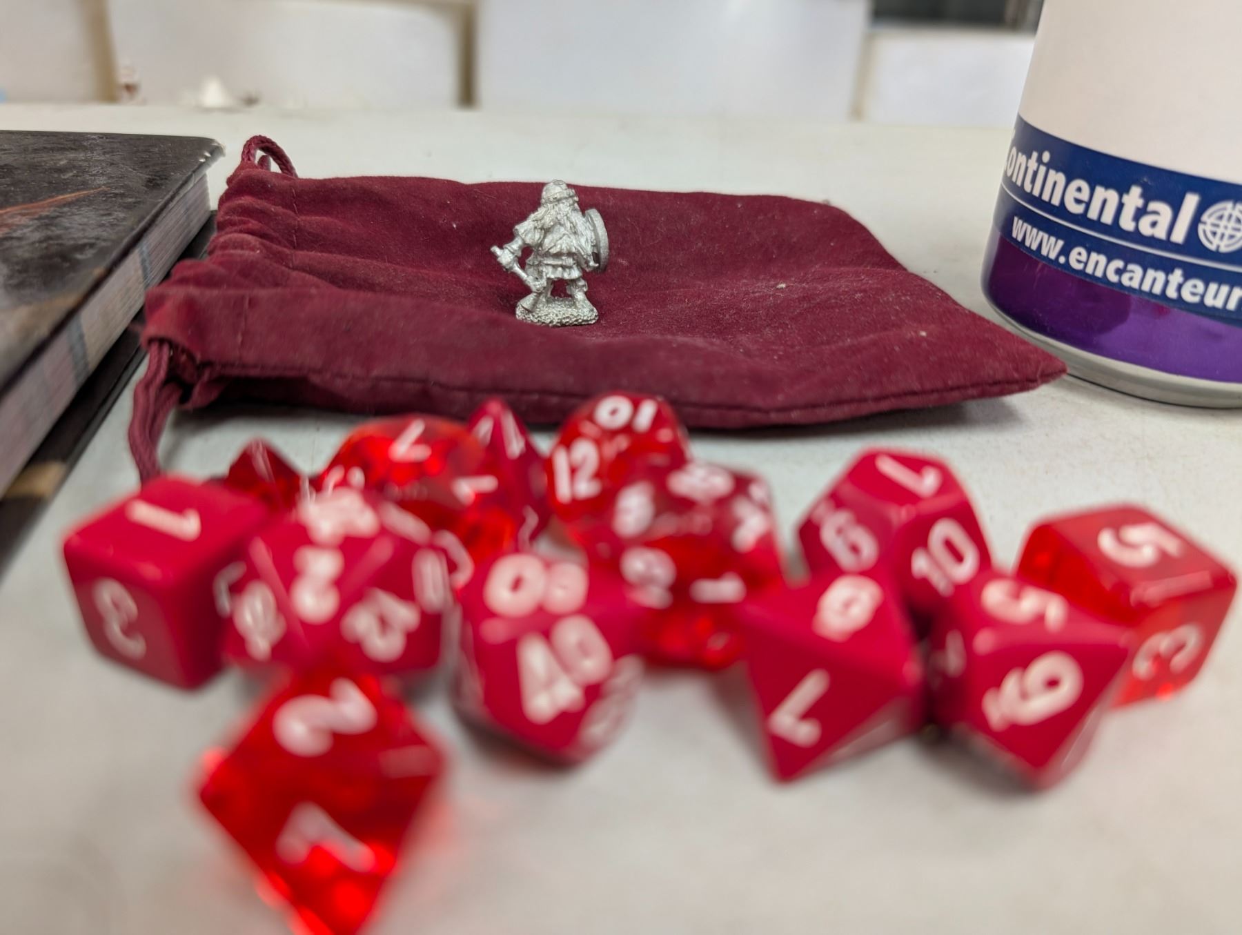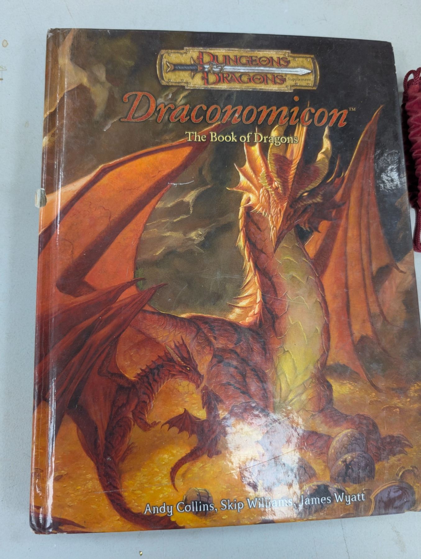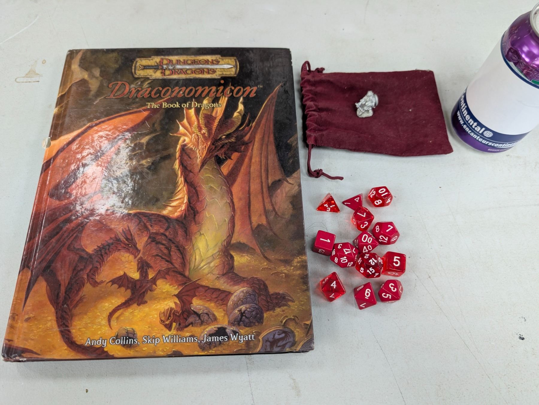 1 BOOK OF DRAGONS - 1 POUCH OF DICE - 1 DIE CAST DWARF FIGURINE