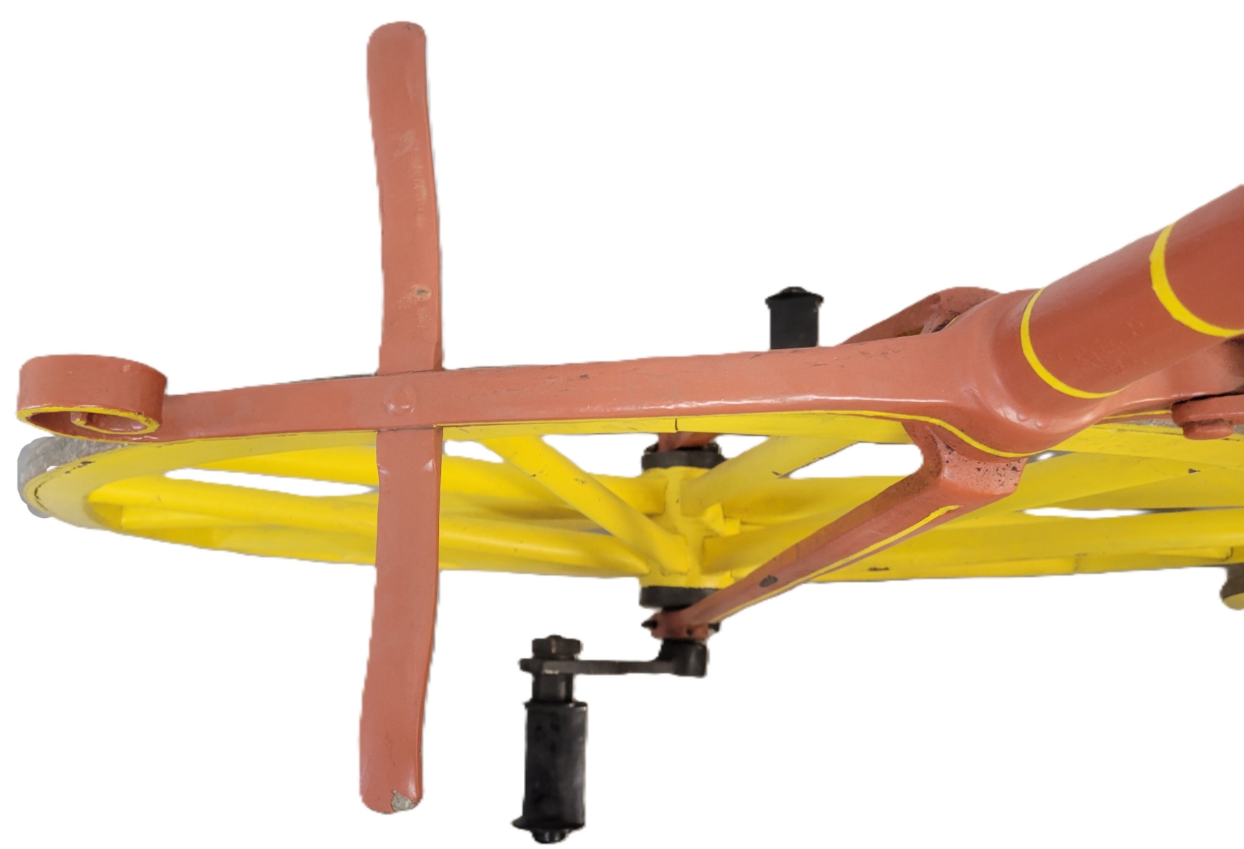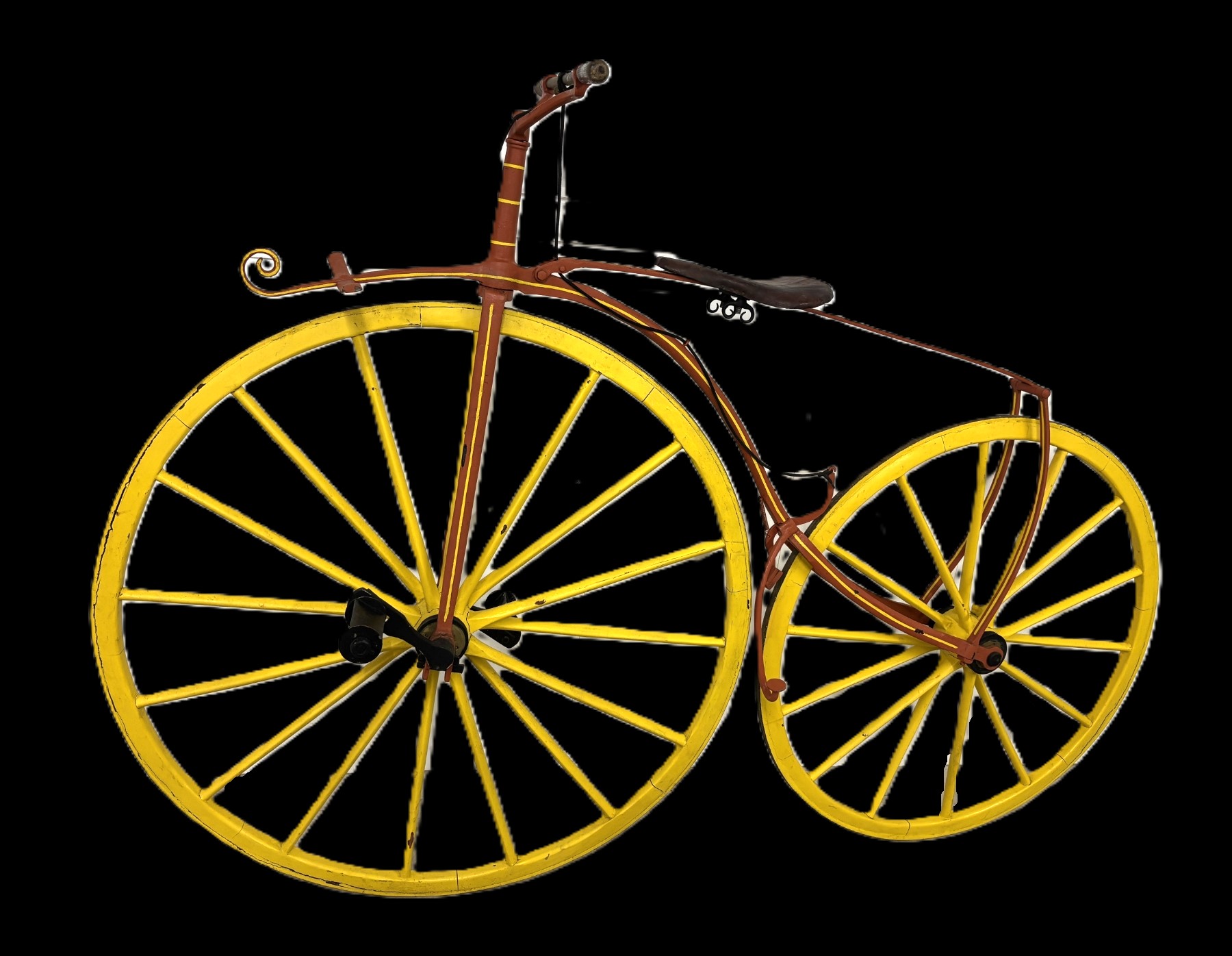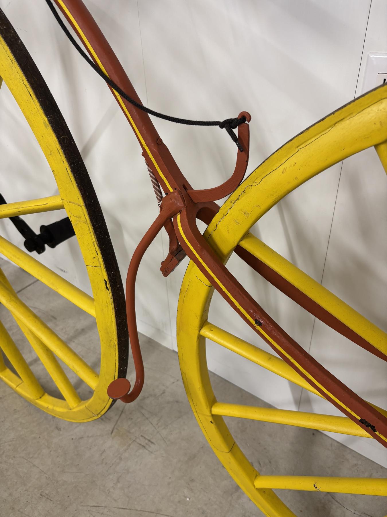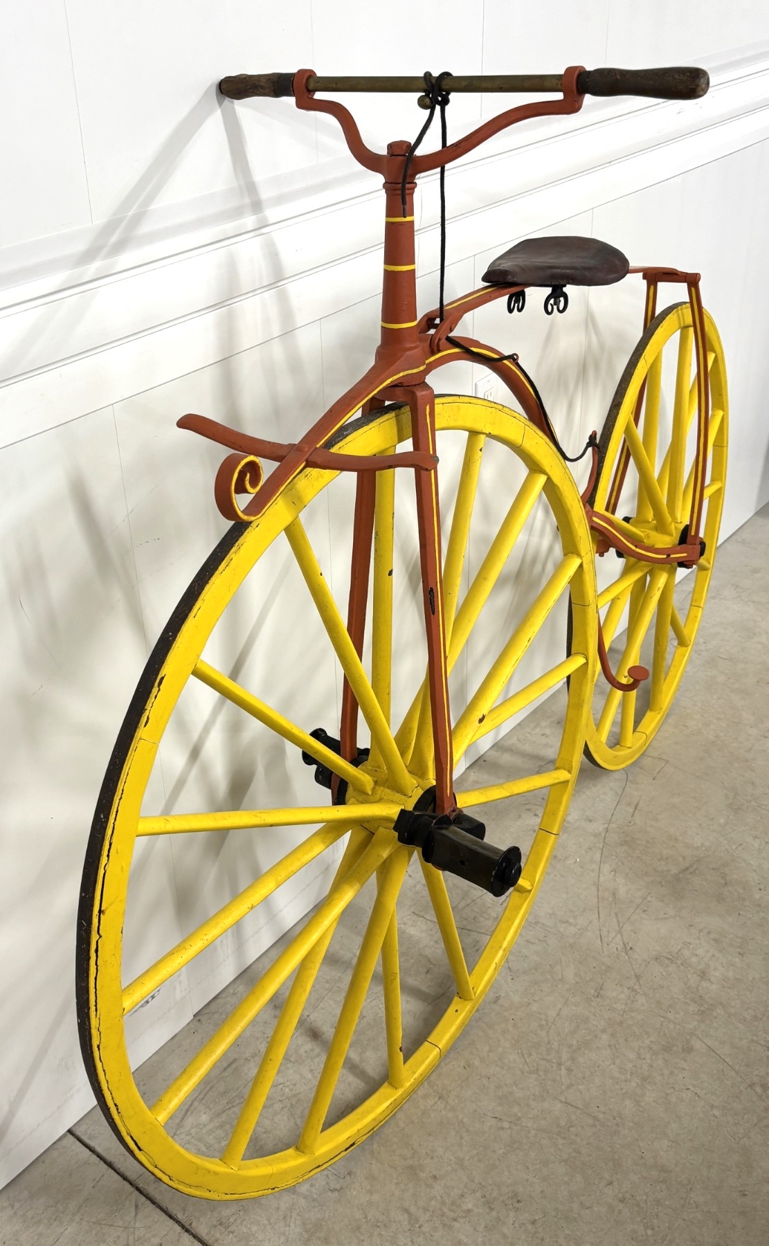 NOTE: VINTAGE HIGH WHEEL VELOCIPEDE STYLE BICYCLE. 43IN SEAT HEIGHT - LEATHER SADLE SEAT - 30 & 31IN DIA WOOD SPOKE WHEELS - SHIPPING TO BE ARRANGED BY BIDDER - HAND CONTROL BRAKES BUT NEEDS NEW WIRE - STEEL FRAME - REPAINTED.