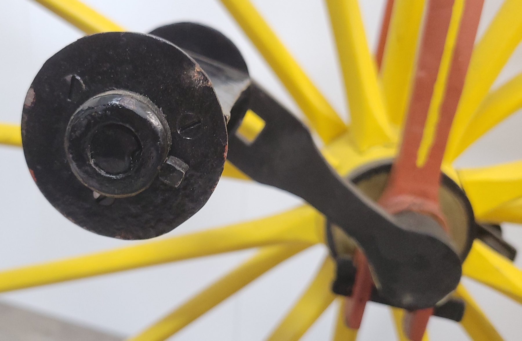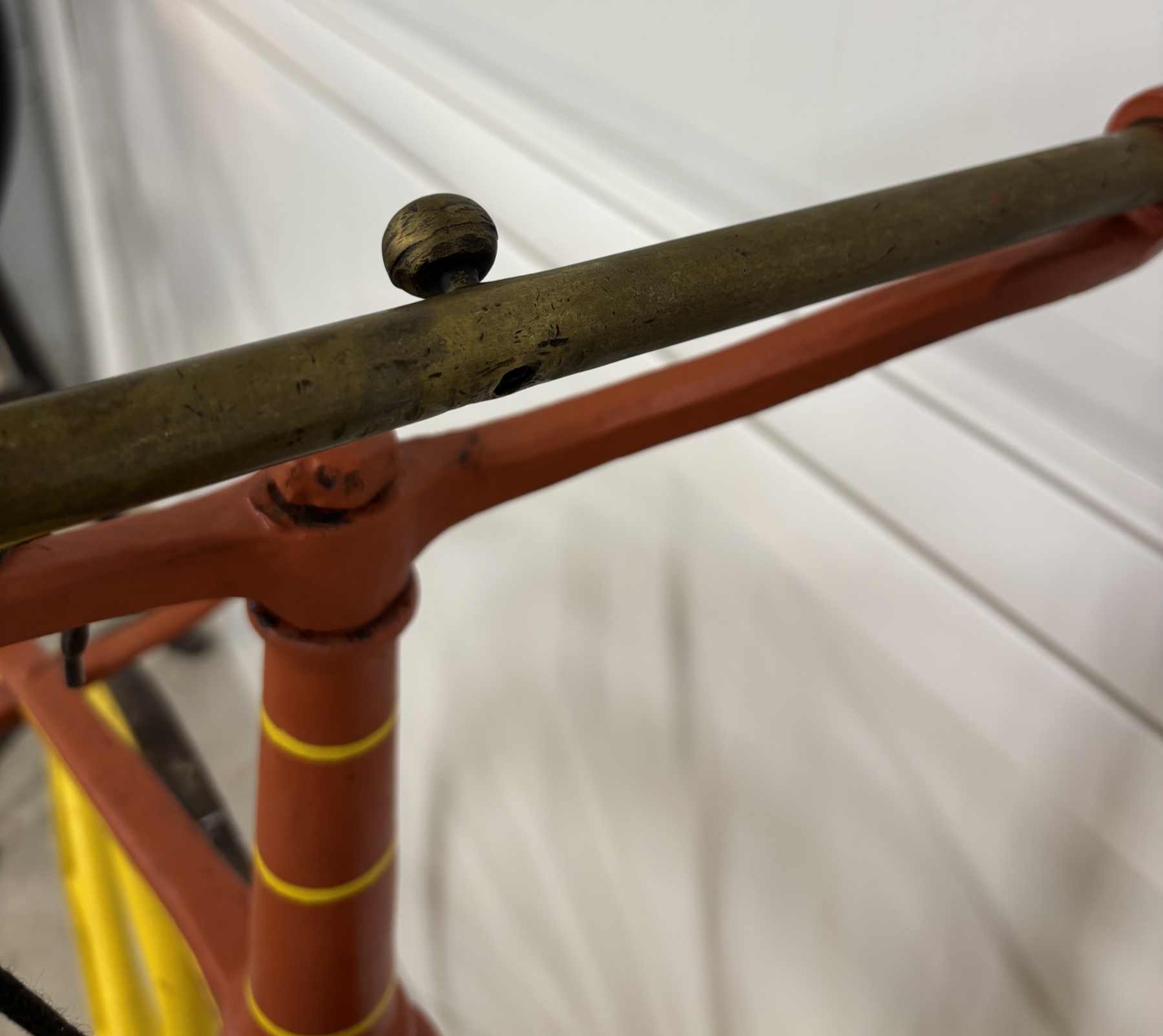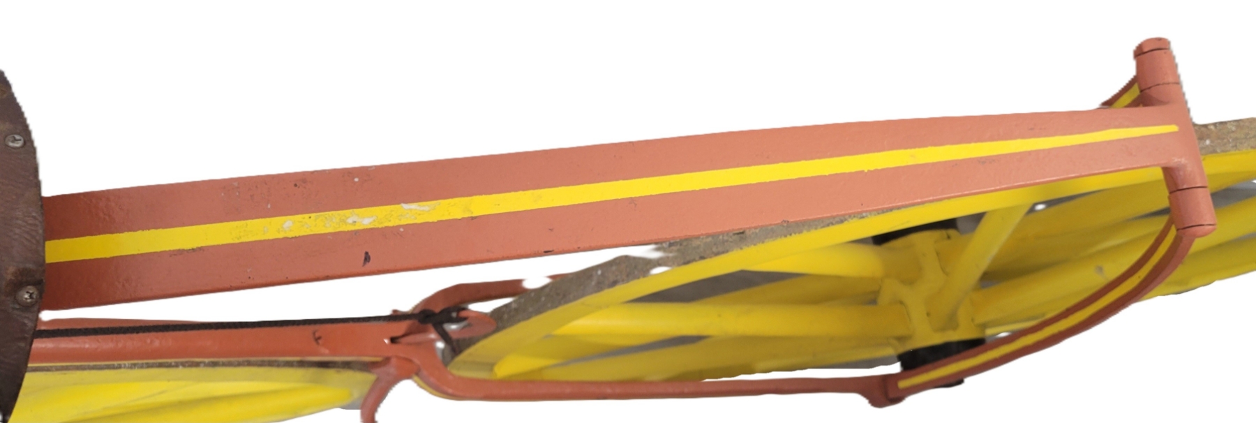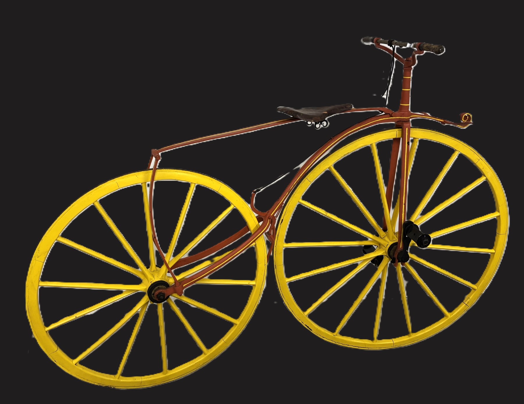 NOTE: VINTAGE HIGH WHEEL VELOCIPEDE STYLE BICYCLE. 43IN SEAT HEIGHT - LEATHER SADLE SEAT - 30 & 31IN DIA WOOD SPOKE WHEELS - SHIPPING TO BE ARRANGED BY BIDDER - HAND CONTROL BRAKES BUT NEEDS NEW WIRE - STEEL FRAME - REPAINTED.