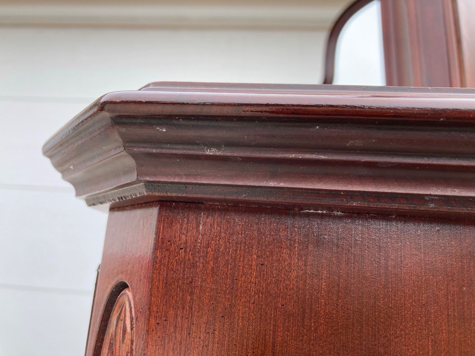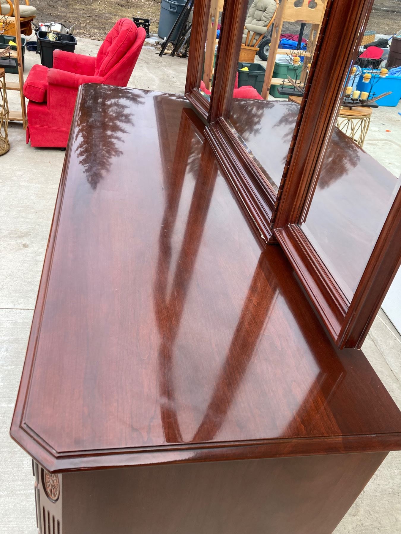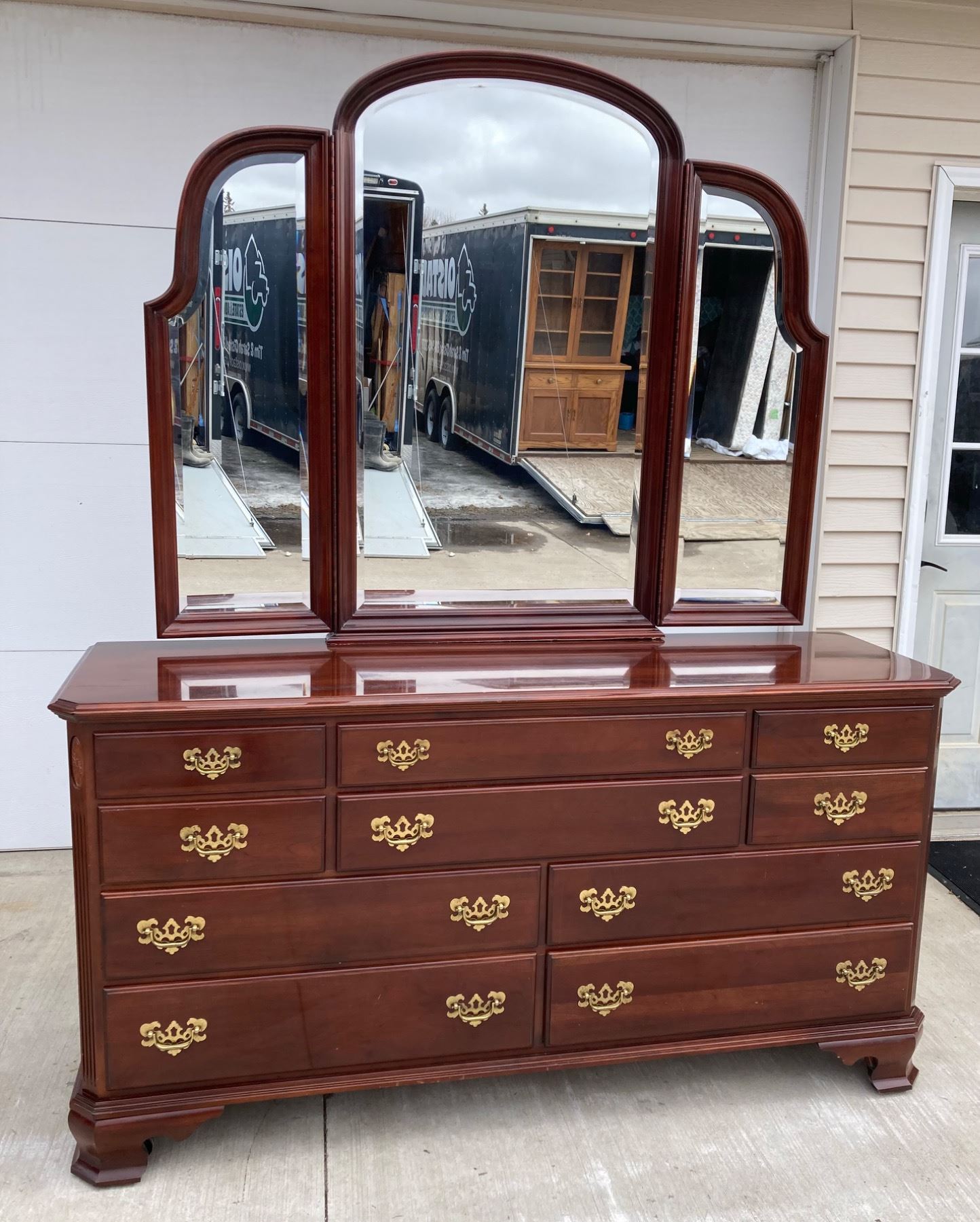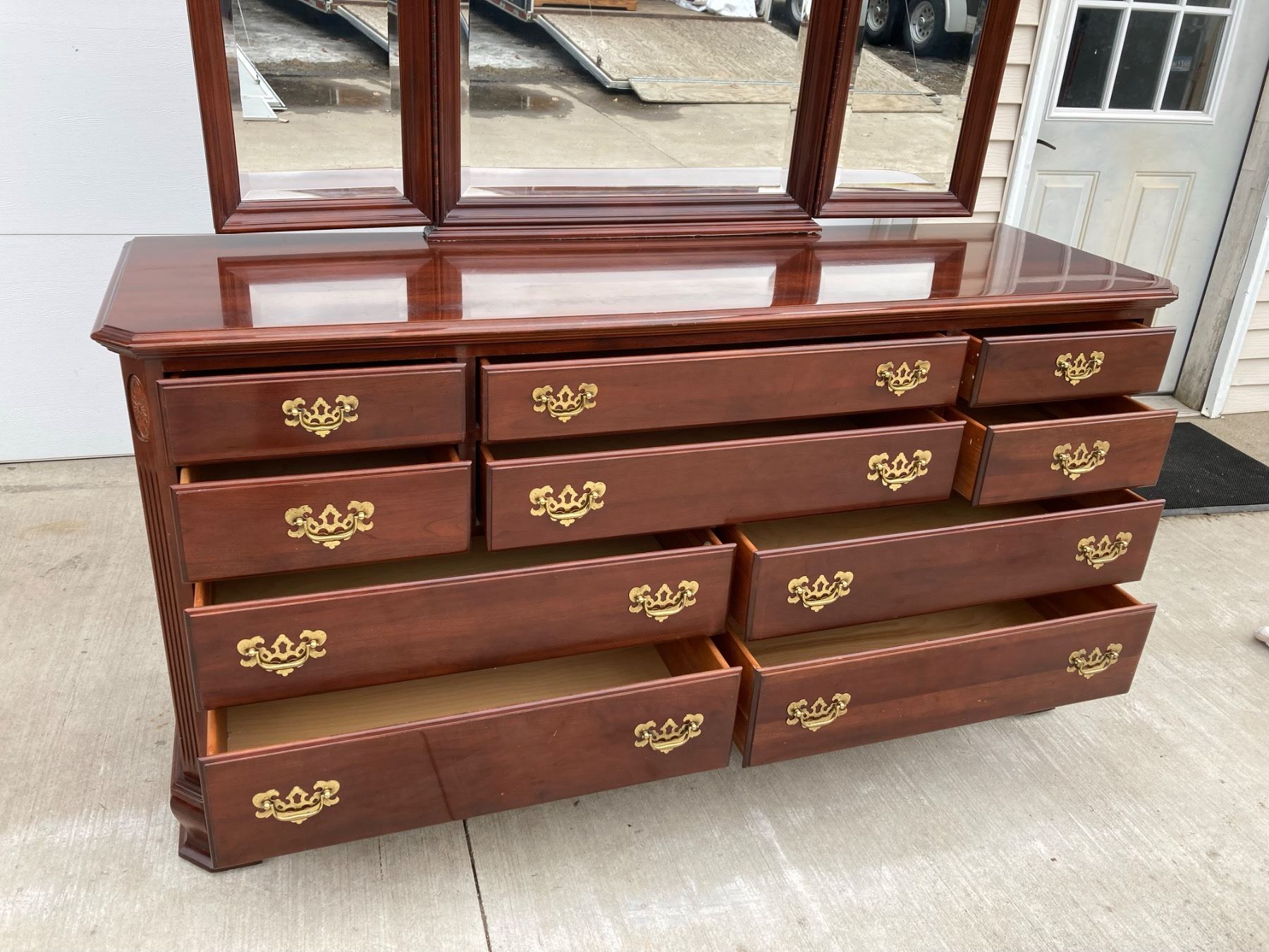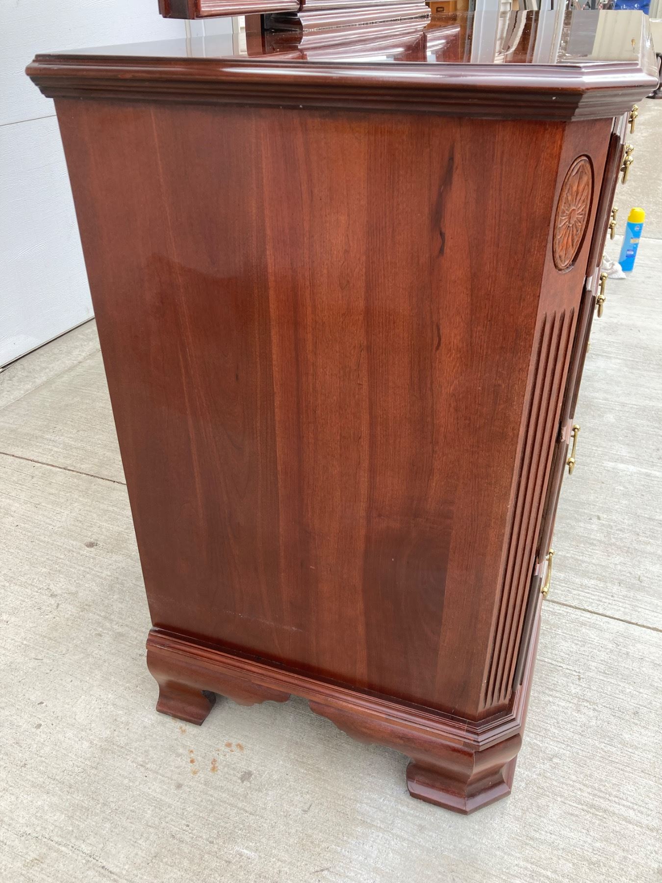 GEORGIAN COURT COLLECTION DRESSER BY ETHAN ALLEN, CRAFTED FROM SOLID CHERRY WOOD IN A TRADITIONAL CHIPPENDALE STYLE; O FEATURES: SHAPED TRI-FOLD MIRROR; 10 DRAWERS (OFTEN DESCRIBED AS A "TRIPLE DRESSER"); DOVETAILED DRAWER CONSTRUCTION FOR DURABILITY