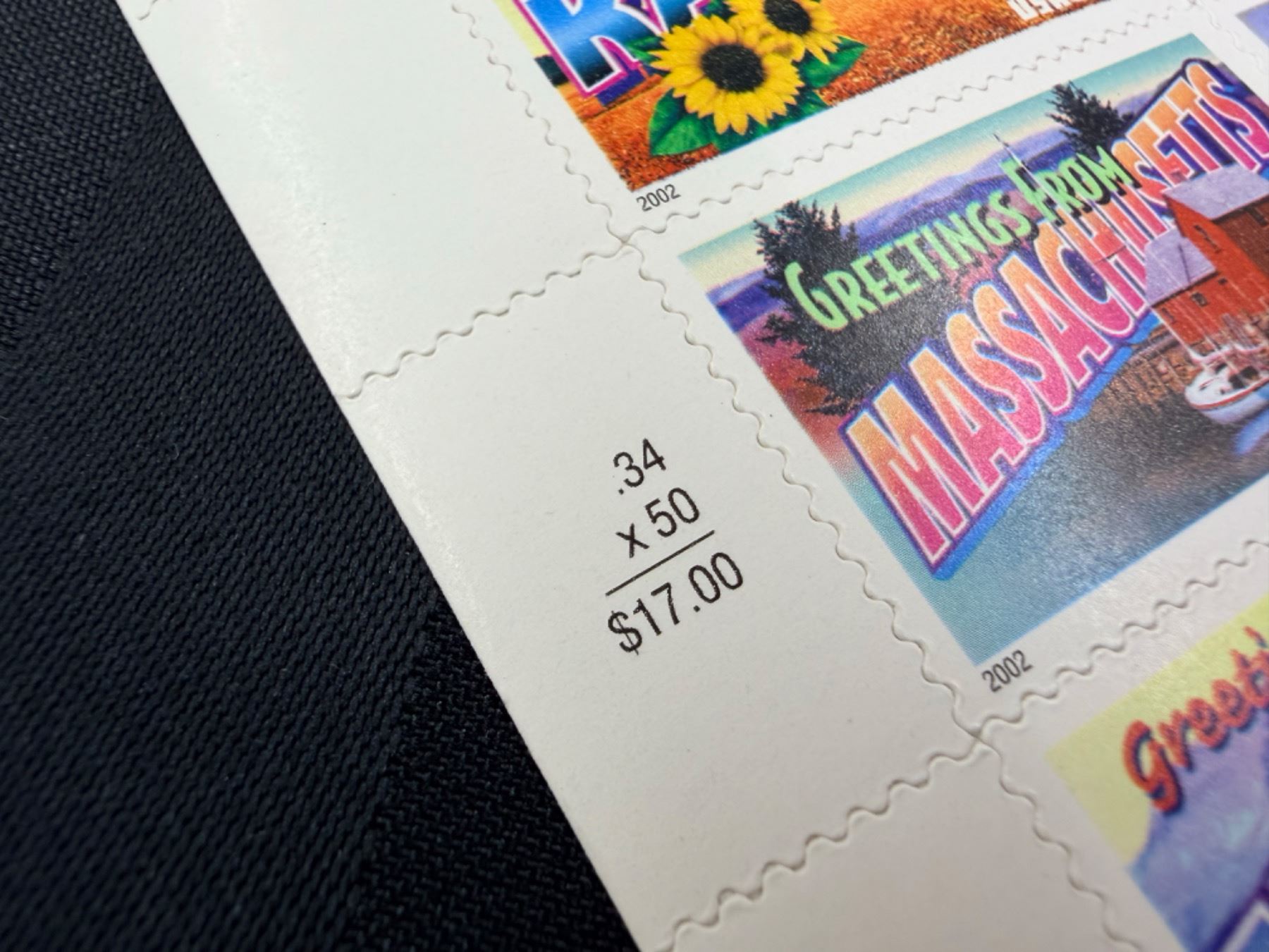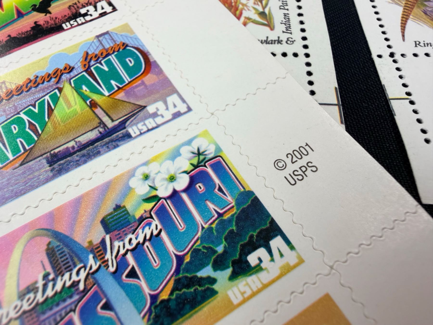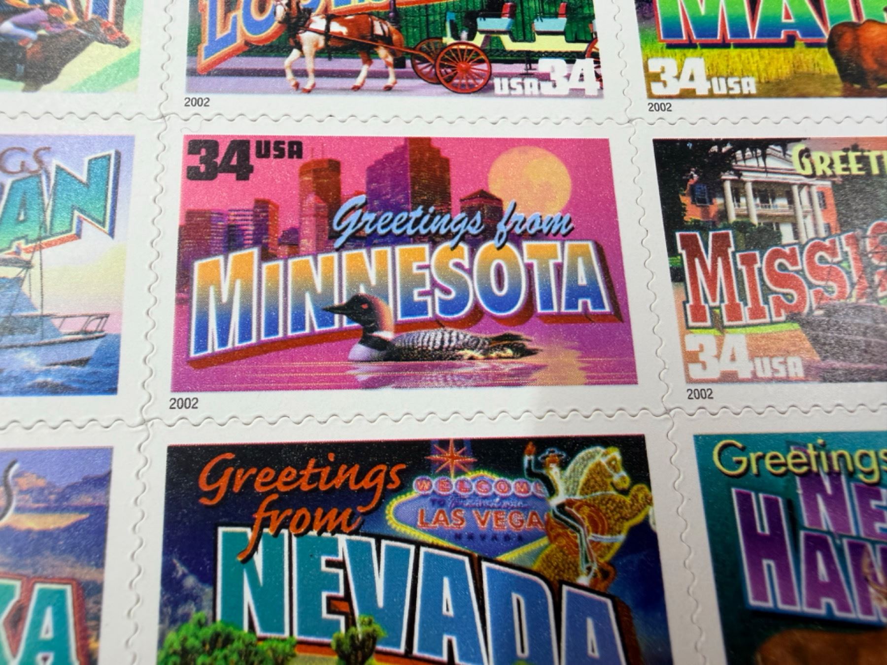 "GREETINGS FROM AMERICA" (34¢ & 37¢): RELEASED IN 2002, THESE WERE DESIGNED TO LOOK LIKE VINTAGE "LARGE LETTER" POSTCARDS; THE 34¢ VERSION WAS THE FIRST TIME IN U.S. HISTORY THAT A STAMP WAS RELEASED IN EVERY STATE ON THE SAME DAY