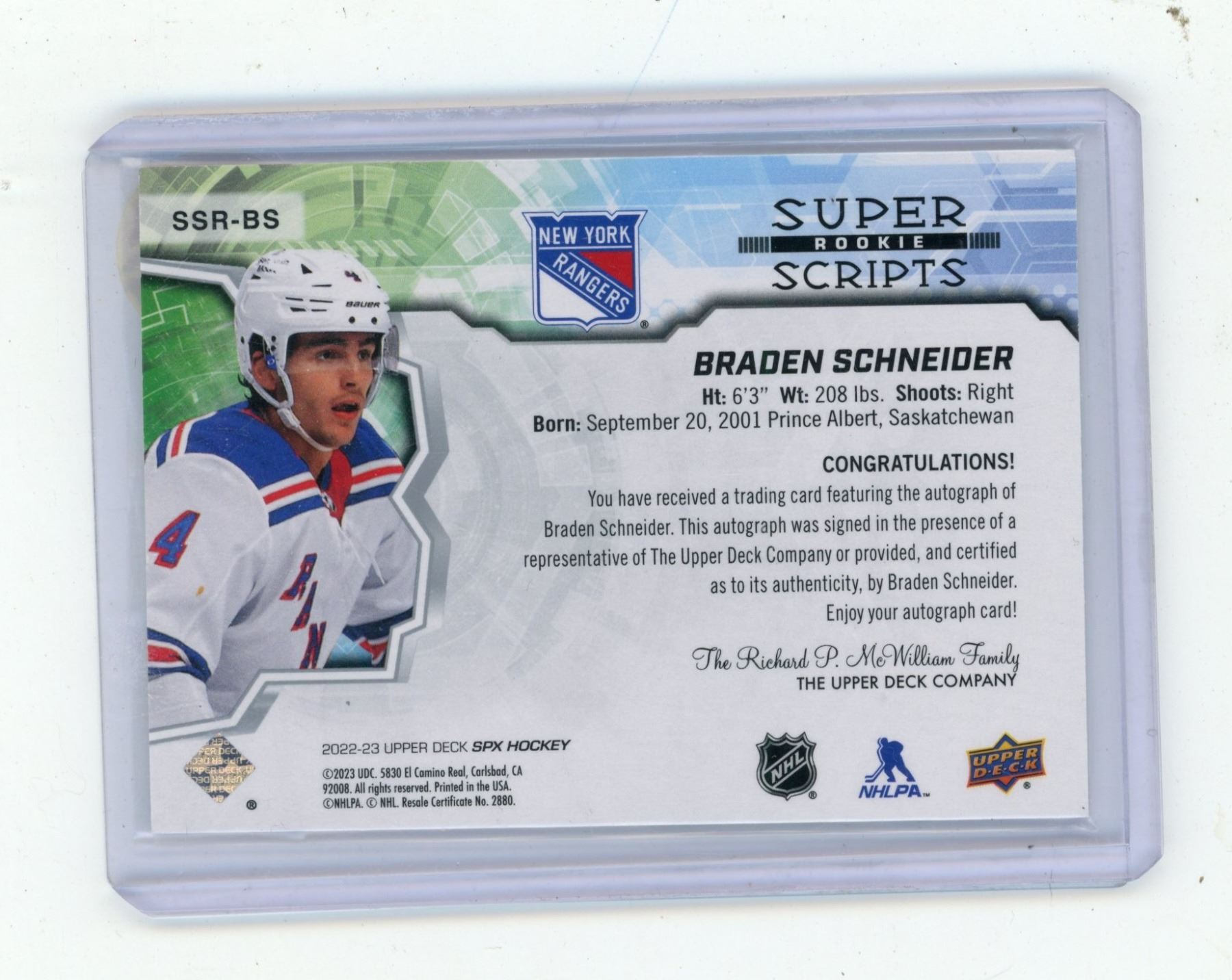 2022-23 Upper Deck SPX Hockey - Braden Schneider - Super Rookie Scripts - Auto from Prince Albert.