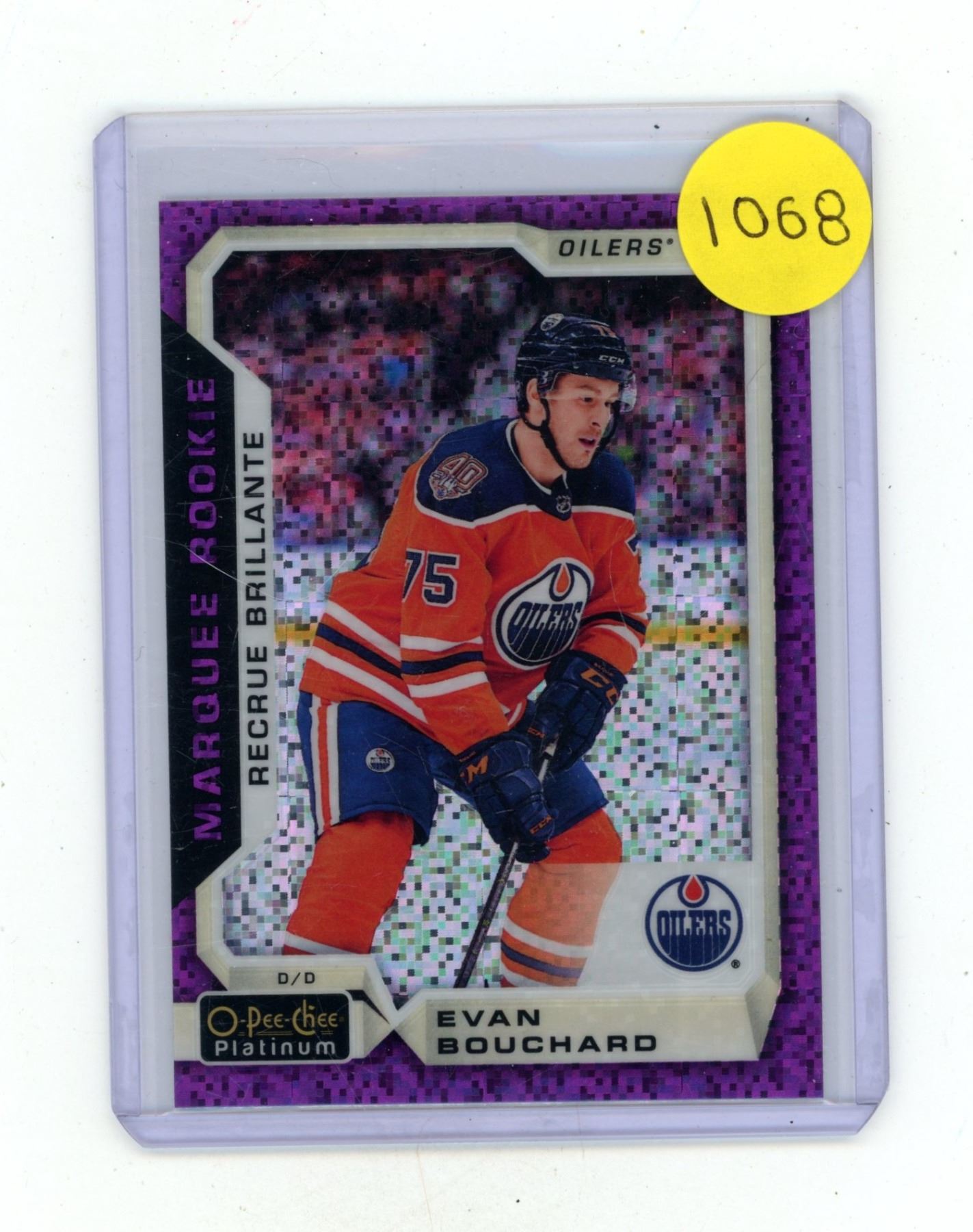 Lot 1068 2018-19 O-Pee-Chee Platinum Hockey - Evan Bouchard - Oilers - Violet Pixels Rookie Card - 157.