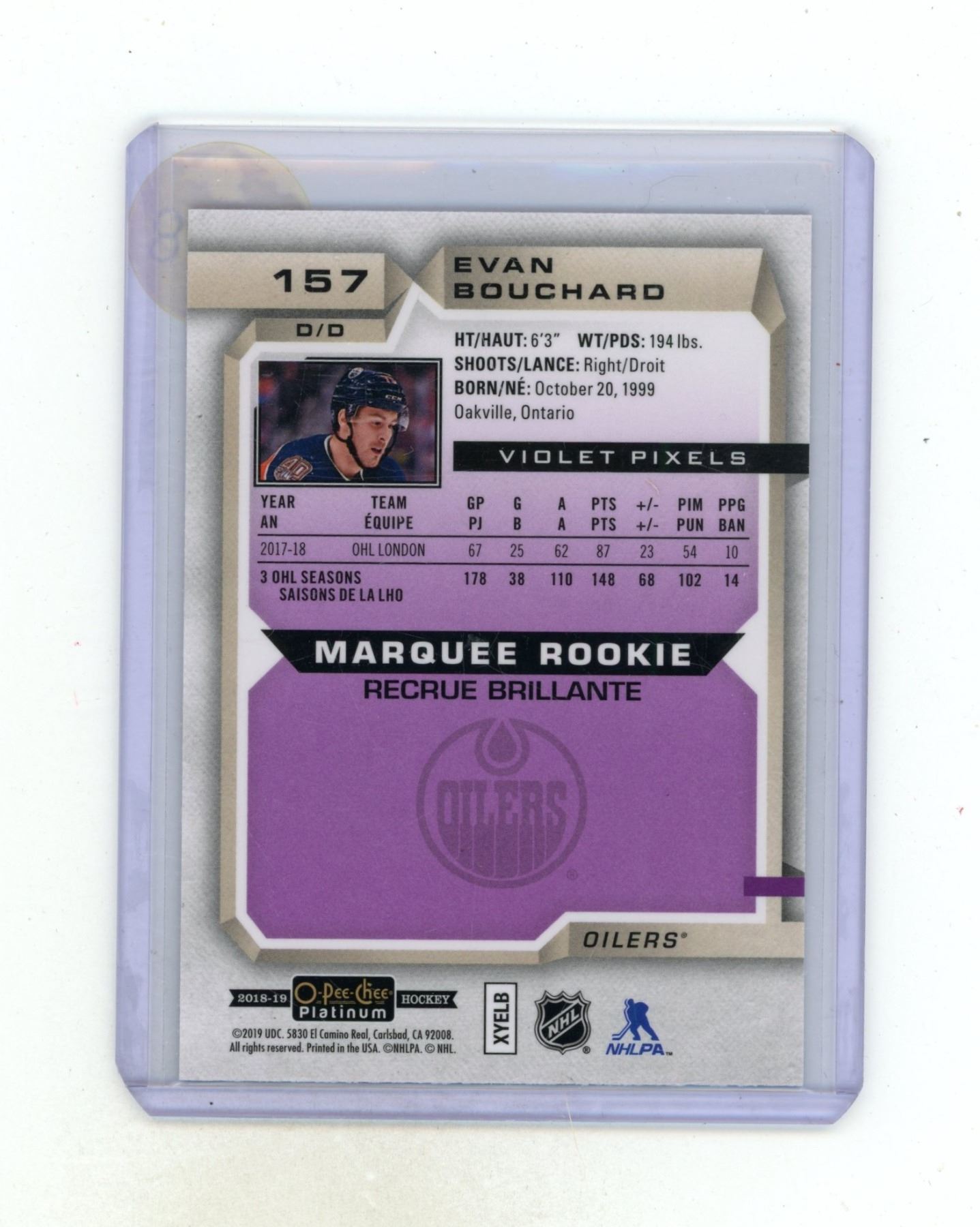 2018-19 O-Pee-Chee Platinum Hockey - Evan Bouchard - Oilers - Violet Pixels Rookie Card - 157.