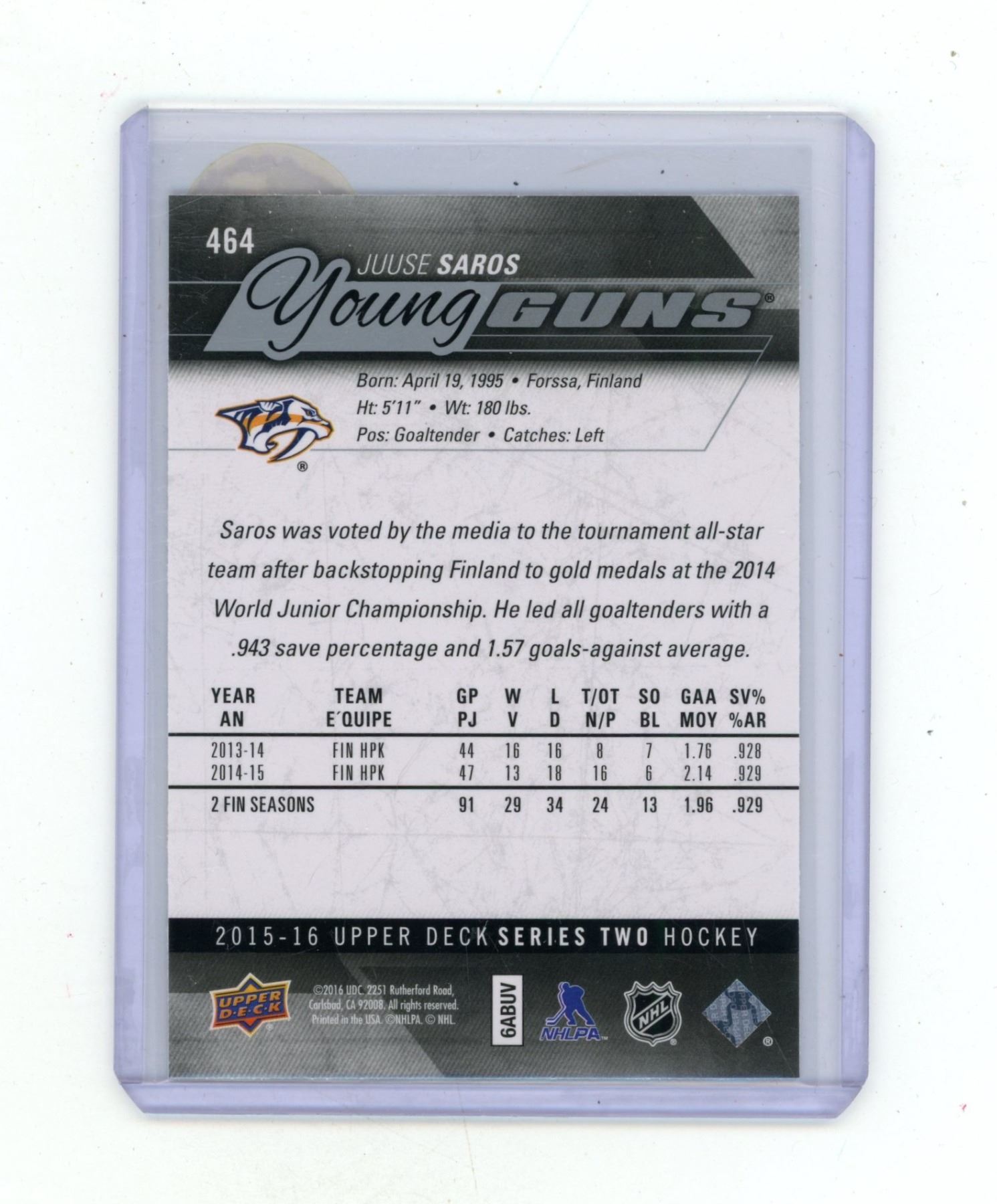 2015-16 Upper Deck Series Two Hockey - Juuse Saros - Young Guns - 464.