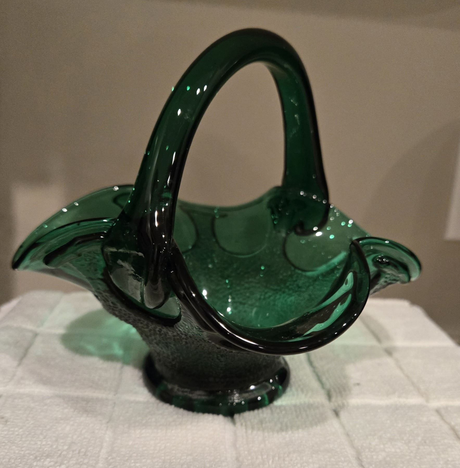 Lot 1113 1113 - Vintage Murano or Empoli art glass basket. Green color, ruffled edges and applied handle. 5"