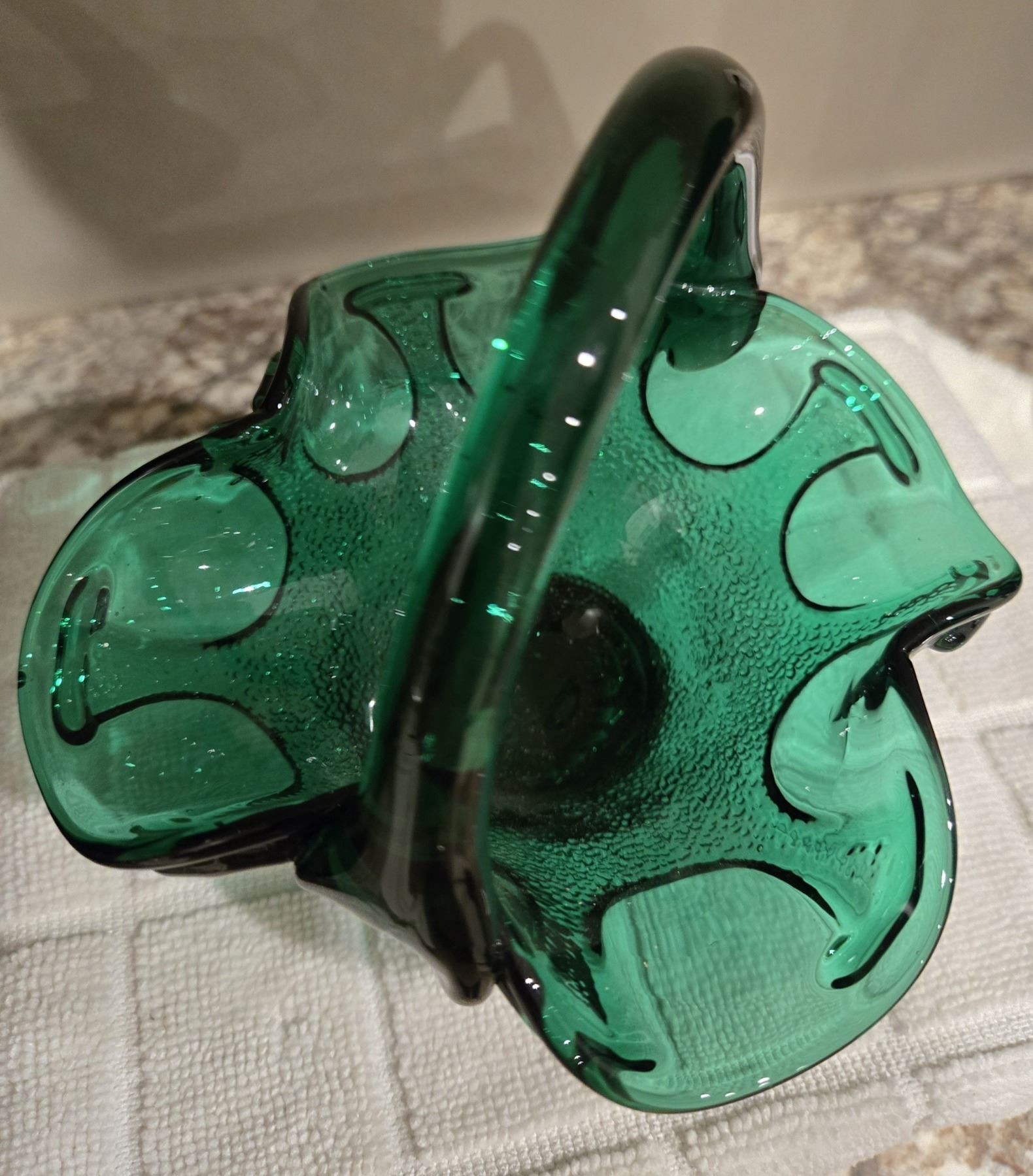 1113 - Vintage Murano or Empoli art glass basket. Green color, ruffled edges and applied handle. 5" across, 6" tall with handle.