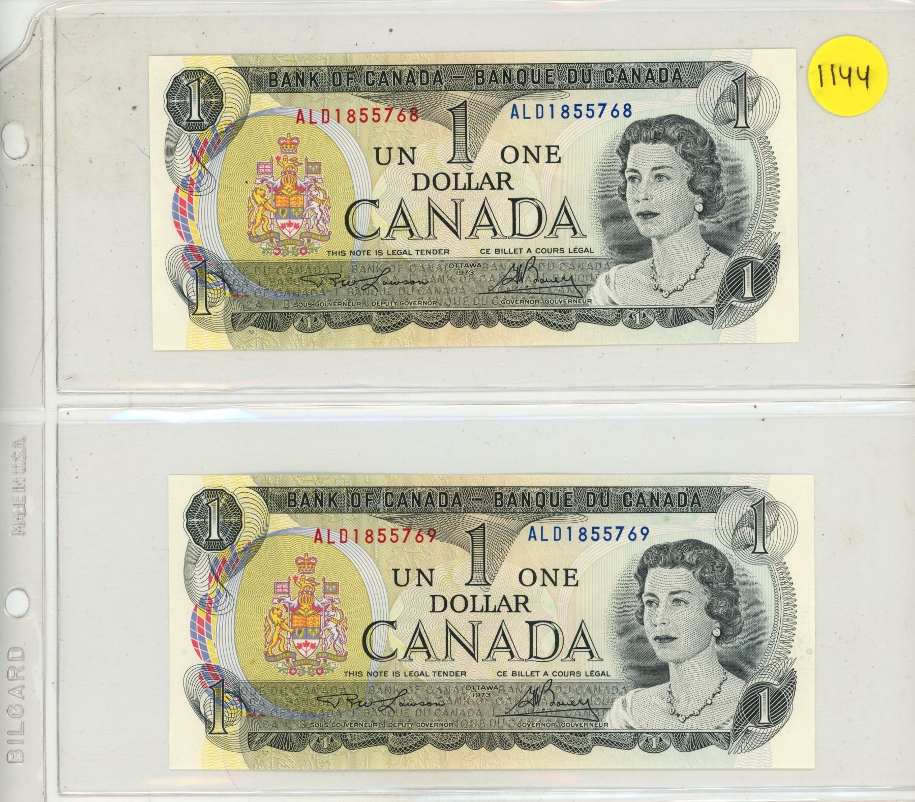 Lot 1144 1973 2 Canadian One Dollar Bank Notes In Series