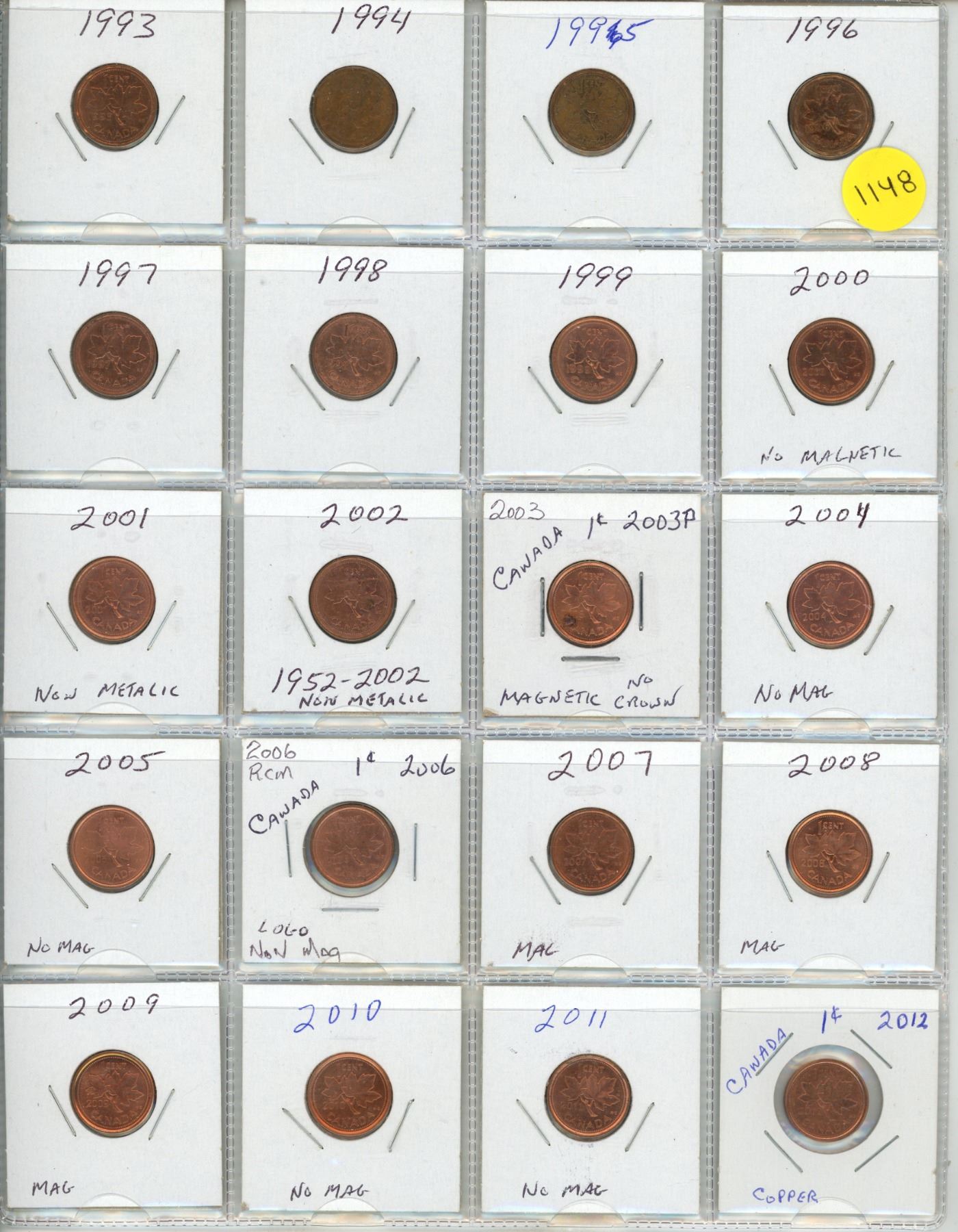 Lot 1148 1993-2012 UNC Sheet Of Canadian Small Cents - 20 Coins