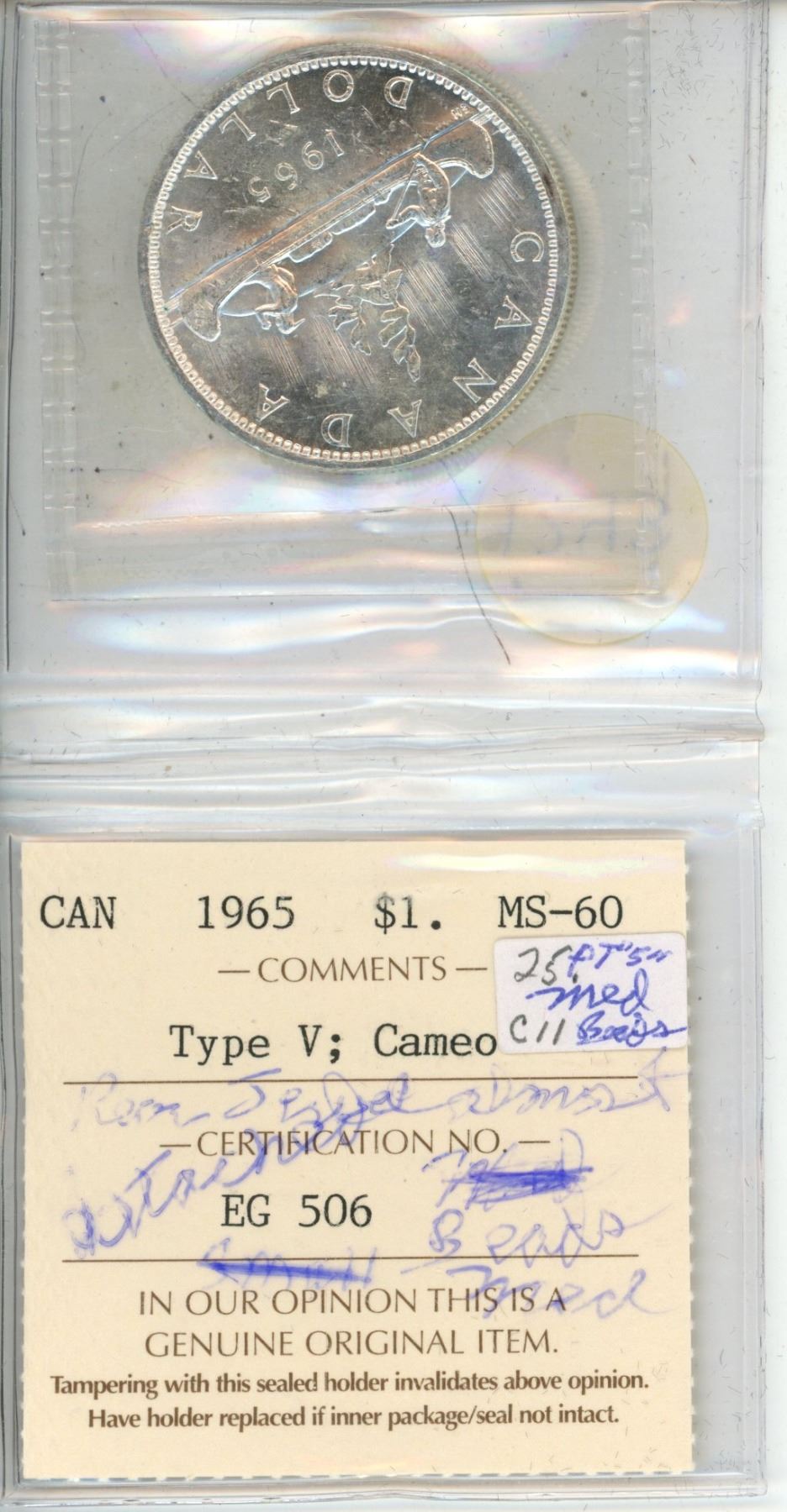 1965 Canadian Silver Dollar - ICCS MS-60 25 Points