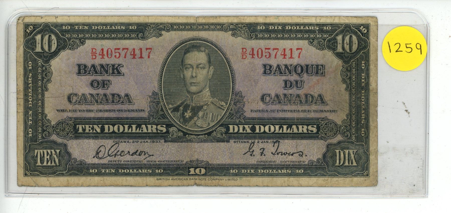 Lot 1259 1937 Bank Of Canada Ten Dollar Bank Note