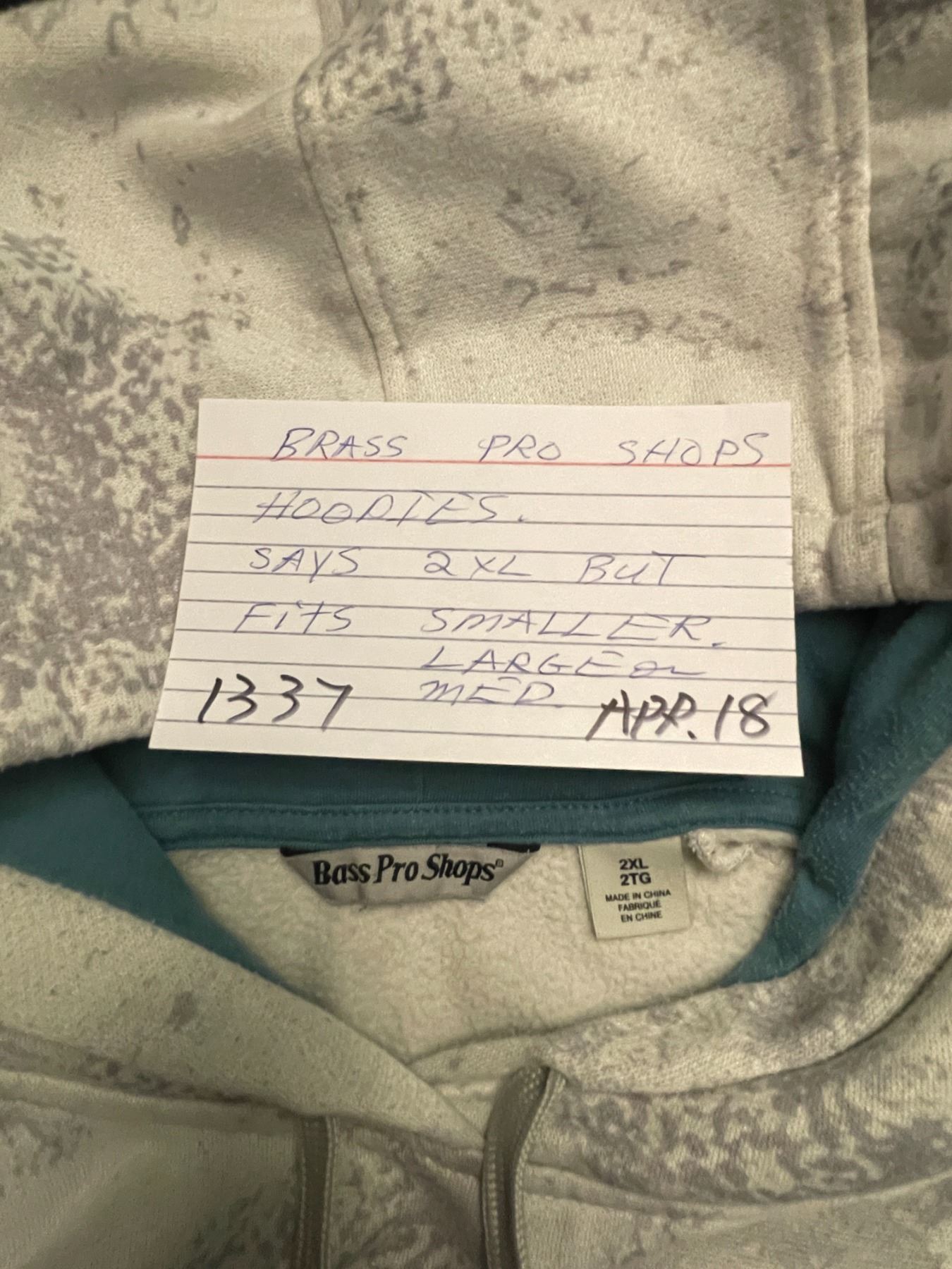 Lot 1337 Bass Pro Shop hoodie - labelled 2XL but fits smaller Lg or Med