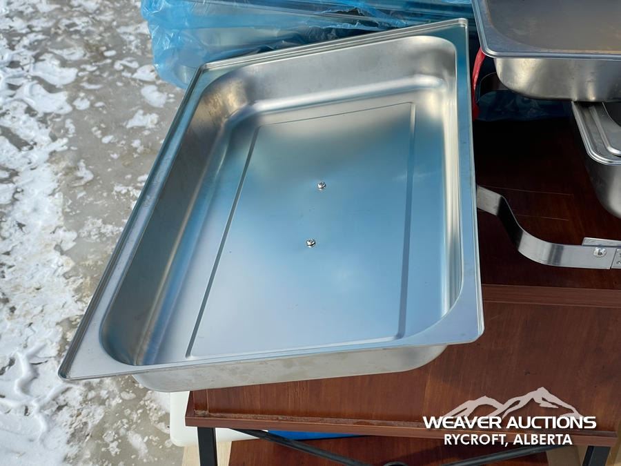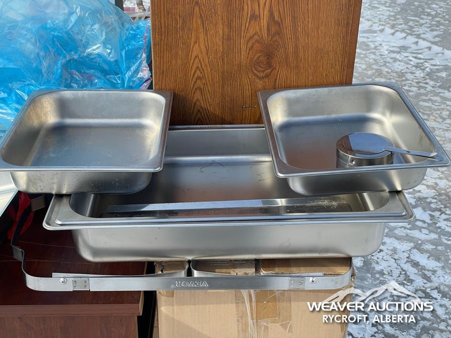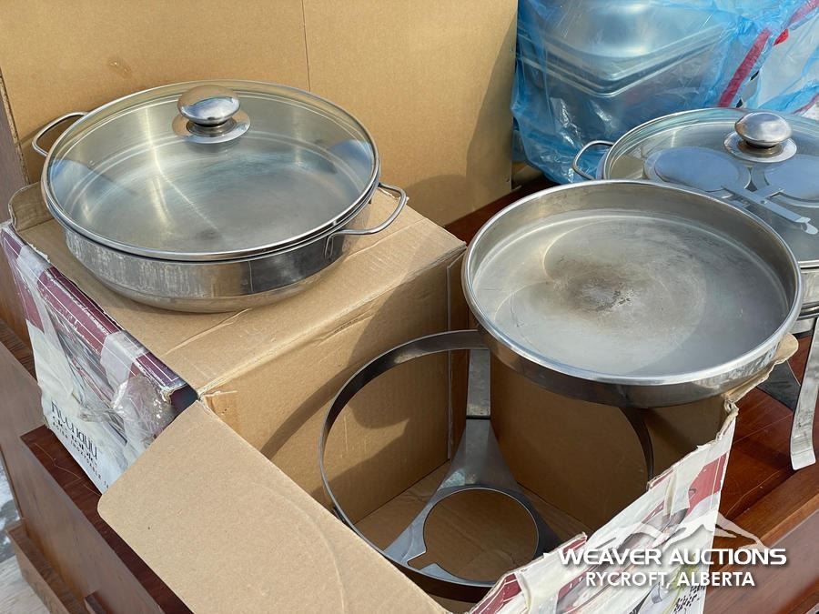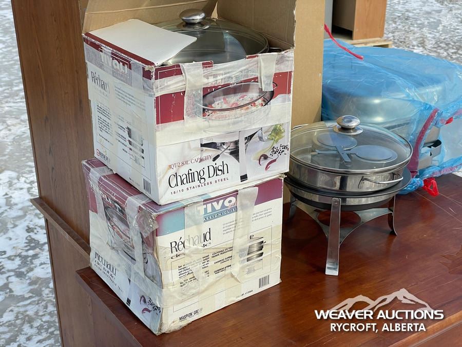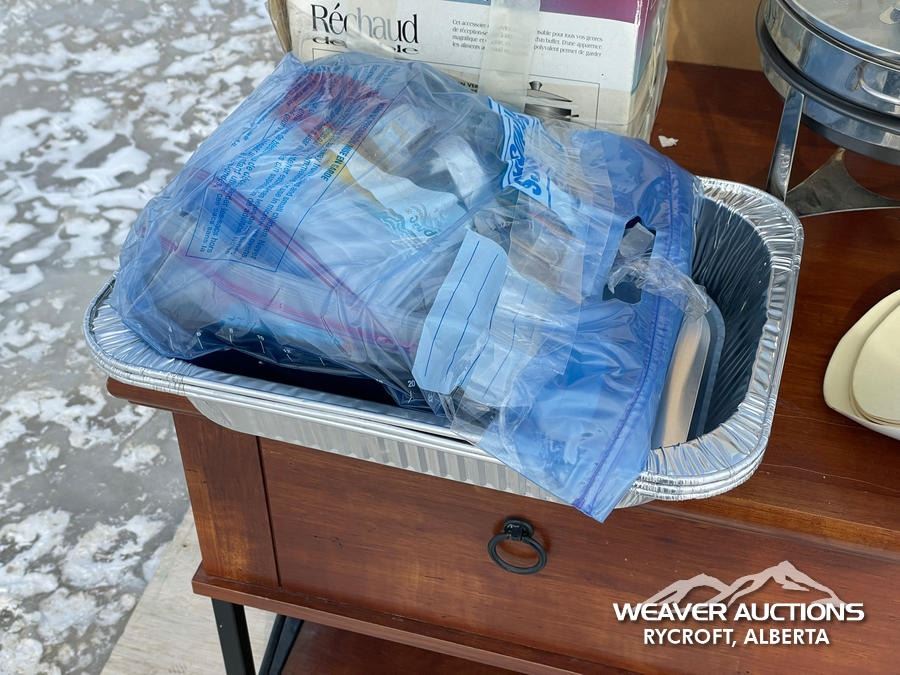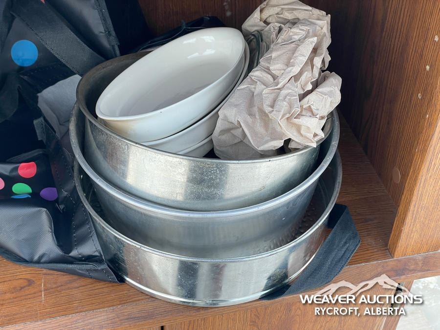 Specifications: (2) LARGE CHAFFING DISHES W/SERVING PANS & LIDS, (3) SIDE DISH CHAFFING PANS, (2) 16 PCS MATCHING DISH SETS, SMALL GLASS FOOD STORAGE BOWLS, 3 NEW ALUMINUM ROASTING PANS W/LIDS, ASSORTED BAKING PANS, LG BAG OF ASSORTED COOKIE CUTTERS, HALLWAY SIDE TABLR, LARGE CUTTING BOARD