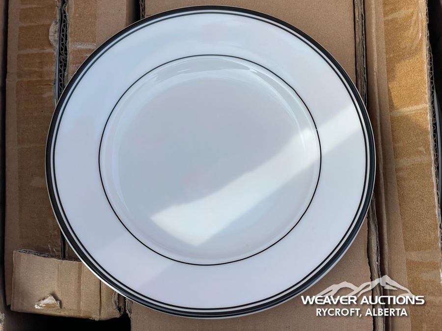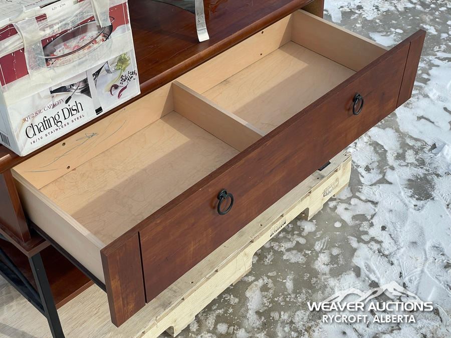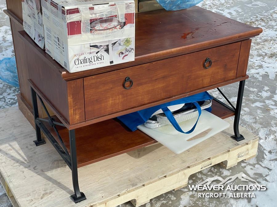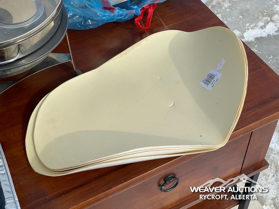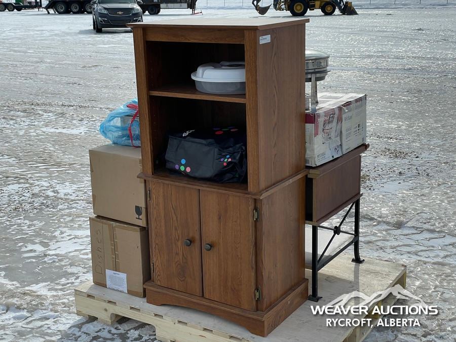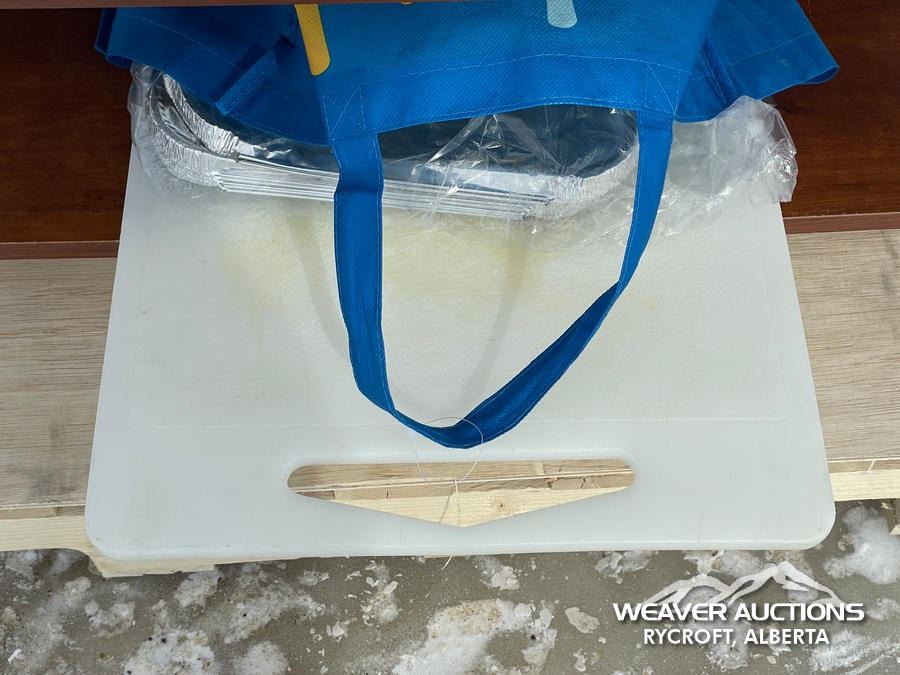 Specifications: (2) LARGE CHAFFING DISHES W/SERVING PANS & LIDS, (3) SIDE DISH CHAFFING PANS, (2) 16 PCS MATCHING DISH SETS, SMALL GLASS FOOD STORAGE BOWLS, 3 NEW ALUMINUM ROASTING PANS W/LIDS, ASSORTED BAKING PANS, LG BAG OF ASSORTED COOKIE CUTTERS, HALLWAY SIDE TABLR, LARGE CUTTING BOARD